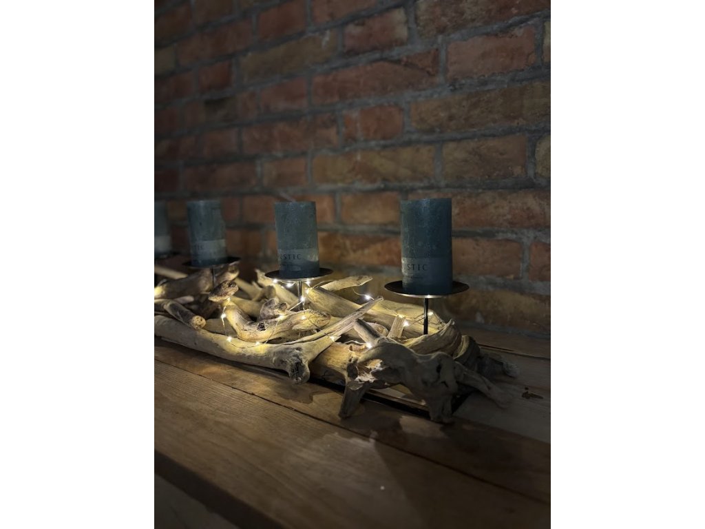 Originální svícen z naplaveného dřeva s pevnou kovovou konstrukcí pro čtyři velké svíčky. Díky svému přírodnímu vzhledu vynikne samostatně, ale lze jej také dozdobit podle vlastní fantazie. Ideální pro prostornější interiéry, kde vytvoří jedinečnou adventní atmosféru.