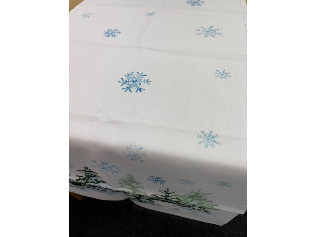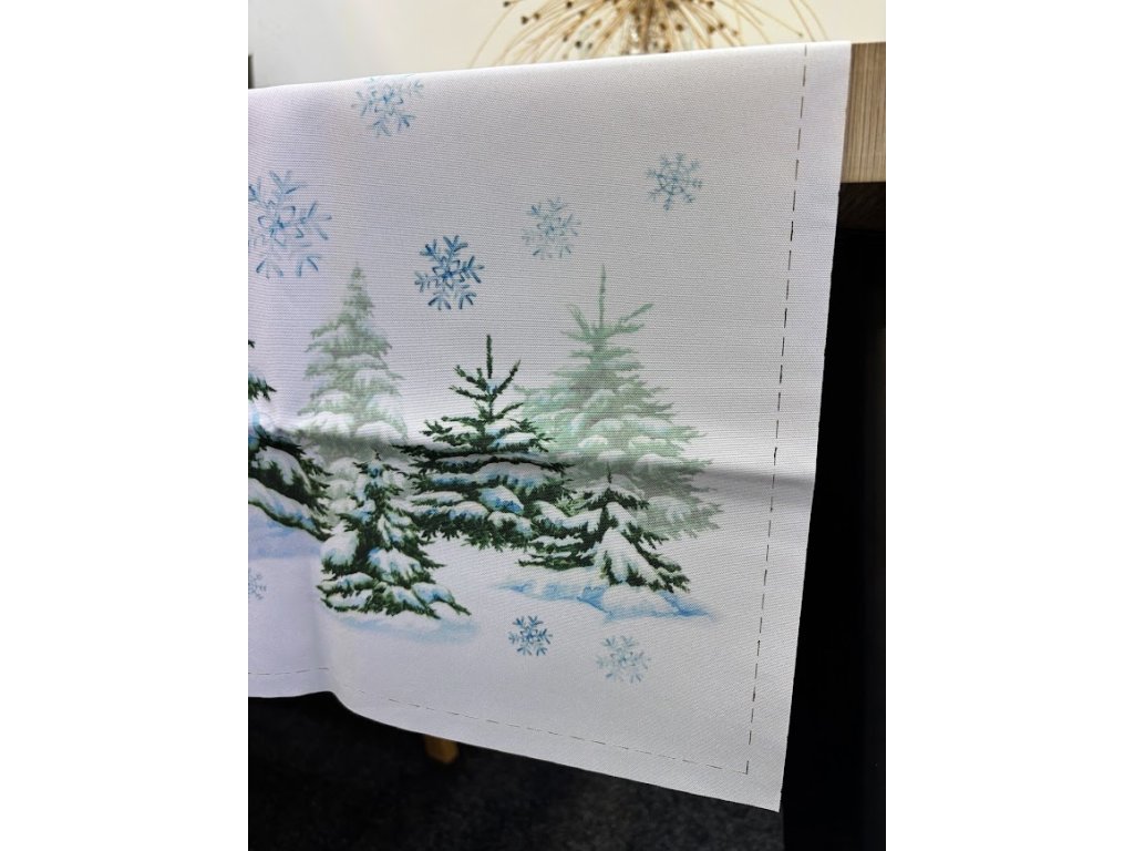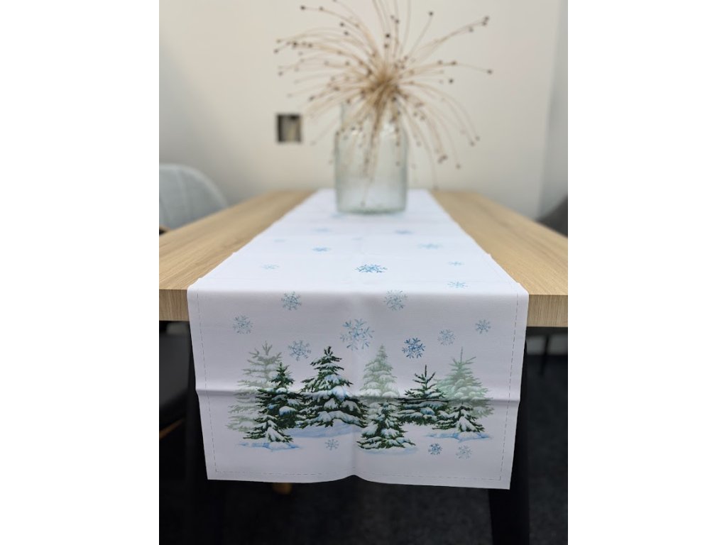 Sněhově bílý běhoun s padajícími vločkami a stromky dodá vašemu stolu slavnostní nádech a krásně doladí celou vánoční výzdobu. Běhoun má po celém obvodu prořezy, aby nedošlo k rozpárání. Je to trochu jiná výroba než jsme zvyklí. Vytvořte si doma útulnou a hřejivou atmosféru během svátečních dní. na výběr jsou dvě varianty délky