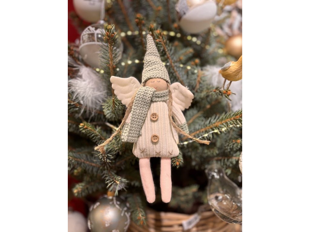 Ručně vyrobená andělka s krásnými pletenými doplňky ozdobí nejen stromeček, ale může být součástí dětského pokojíčku po celý rok. Pletené šatičky s knoflíky doplňuje krásná čepička a šála v mintové barvě. Andělka má křidélka a copánky z provázků. Bude to krásný dárek pro holčičku.
