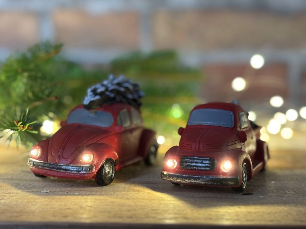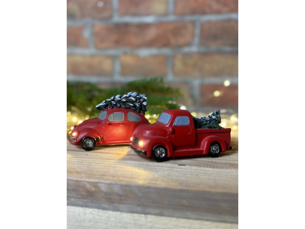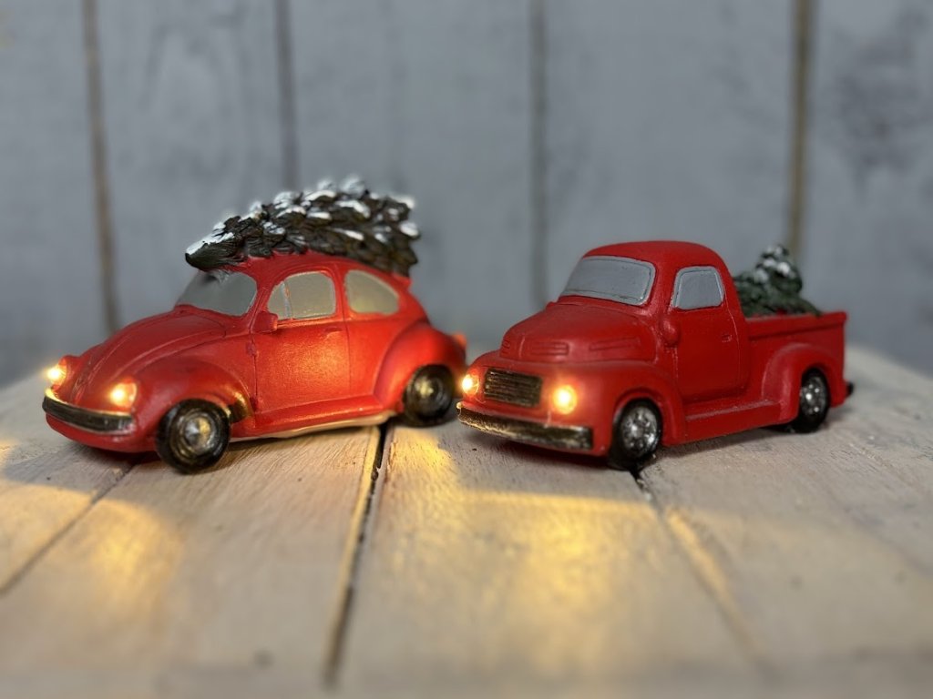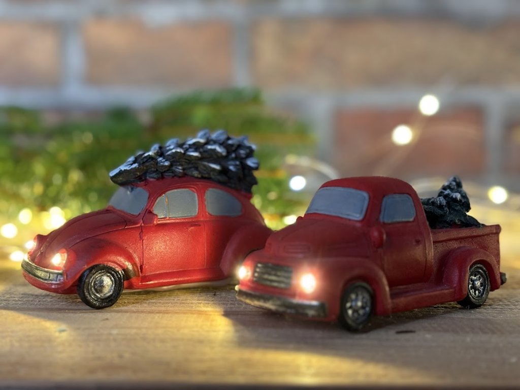Dekorační autíčko s vánočním stromkem na střeše navodí tu pravou sváteční atmosféru. Přední světla skutečně svítí, takže krásně vynikne na poličce i ve vánočním aranžmá. Originální doplněk, který potěší malé i velké – pozor, nejde o hračku, ale o dekoraci.