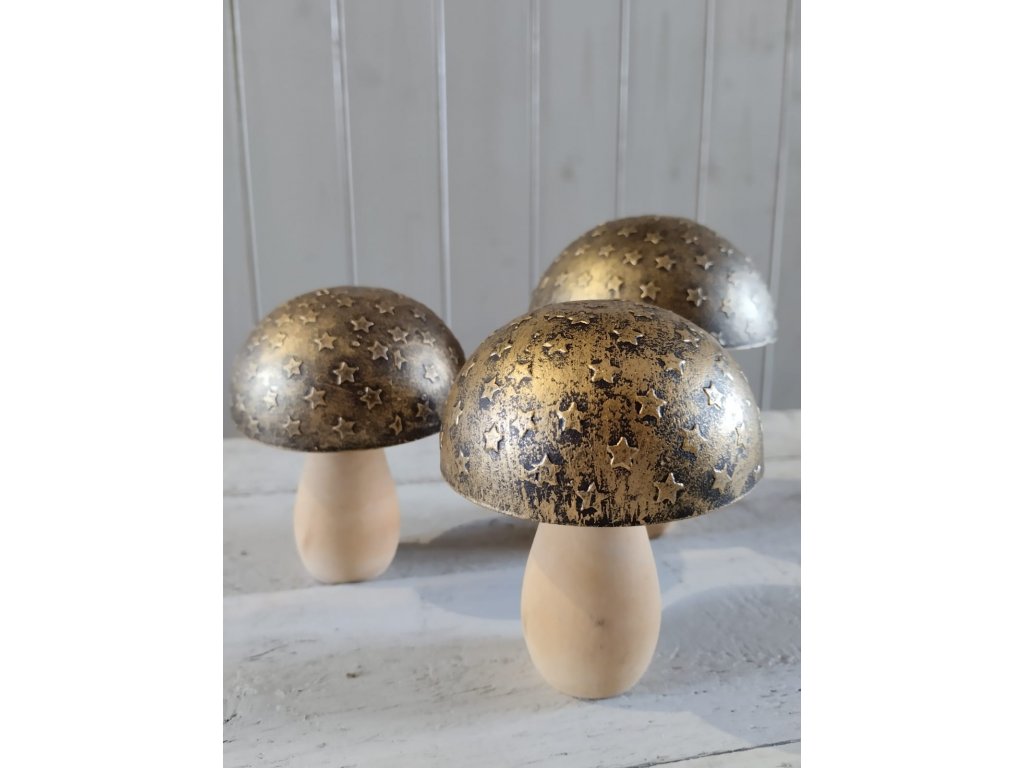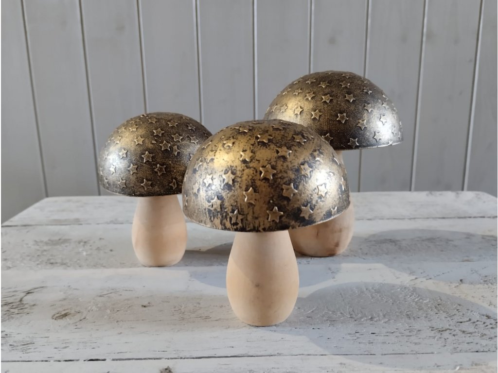 Přijde období babího léta a následně podzim a to je období, na které se těší většina z nás. Vůně lesa a rostoucích hub, procházky, kdy nasbíráte plný košík a máte z toho dobrý pocit. My máme houbičky, které zůstanou pořád krásné a trvalé, jako zajímavost mají čepečky posety zlatými hvězdičkami. Tyto houby můžete využít k dodekorování nebo je usadit někde trvale, kde budou celoroční okrasou. Vybírat můžete ze dvou velikostí. Nožička je z přírodního dřeva, čepička je z kovu.