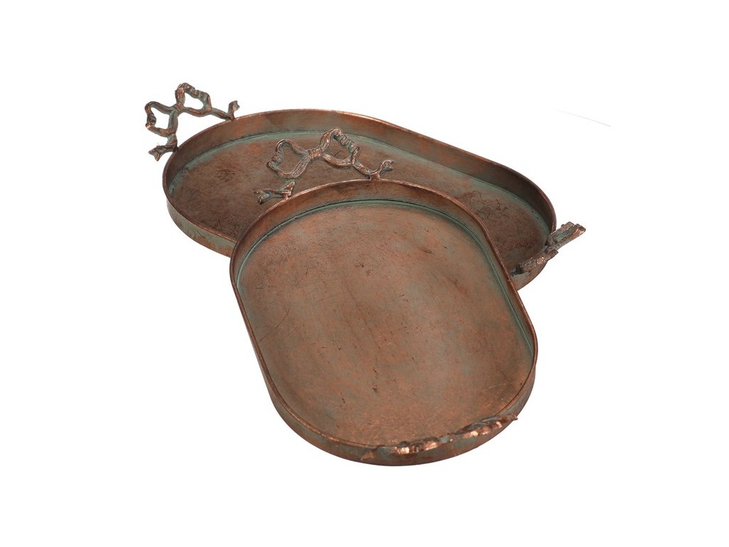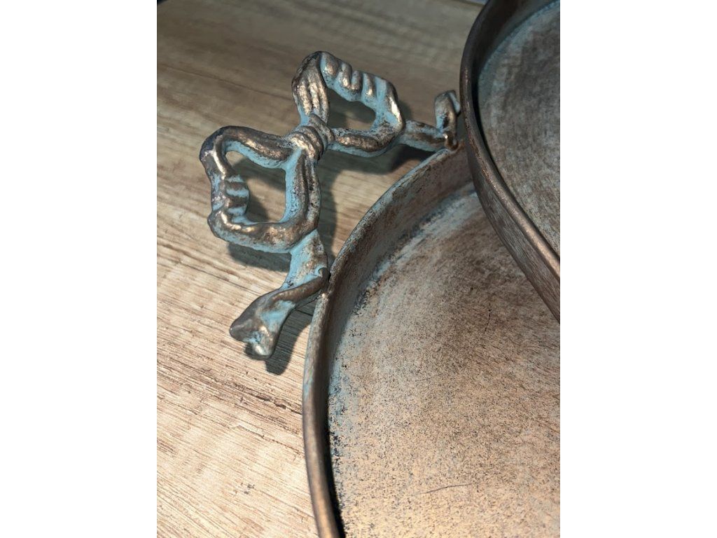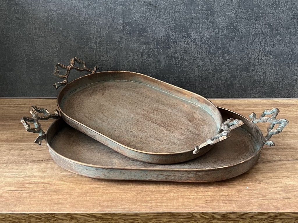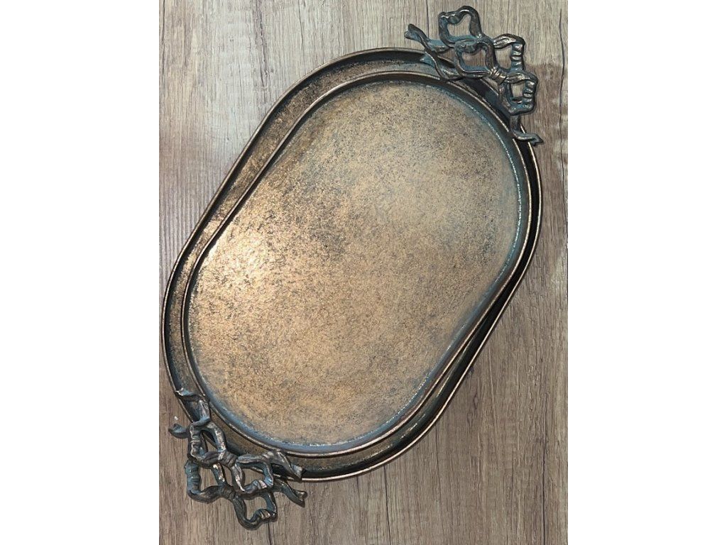 Tác či podnos, každý tomu říká jinak. Máme tu pro vás tyto bronzové podnosy s uchy ve tvaru mašle. Tácy jsou celokovové, barva lehká patina. Můžete je použít na dekoraci nebo na přenesení kávy či čaje pro Vás a Vaši návštěvu. Takové sušenky s lahodnou kávou na něm budou vypadat neodolatelně.