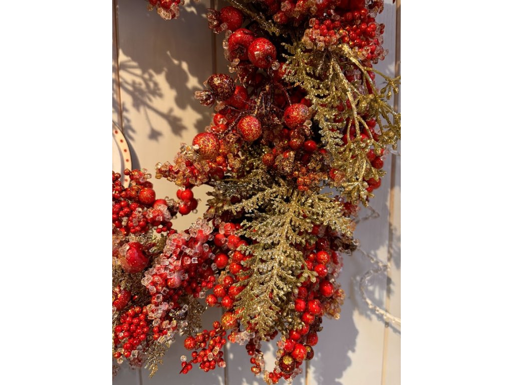 Celoroční dekorační věnec v barvě červeno zlaté dozdobí interiér ať už jako zavěšený nebo volně položený. Věnec je z červených bobulí obohacen o zlaté kapradiny.