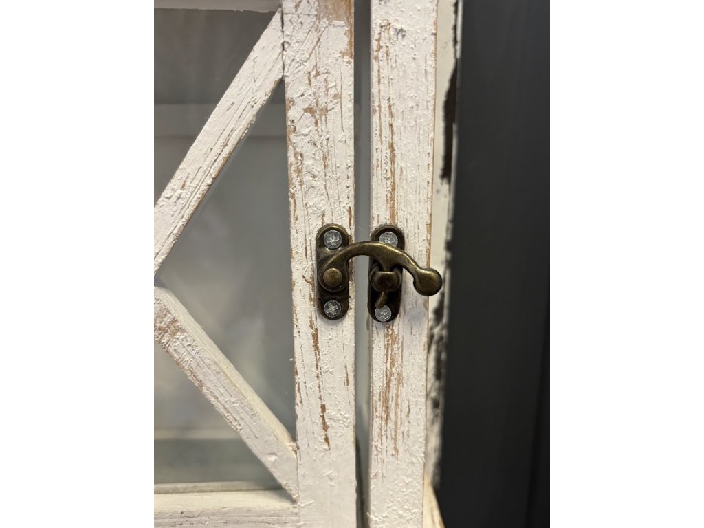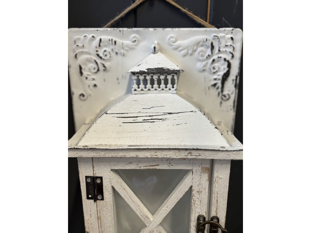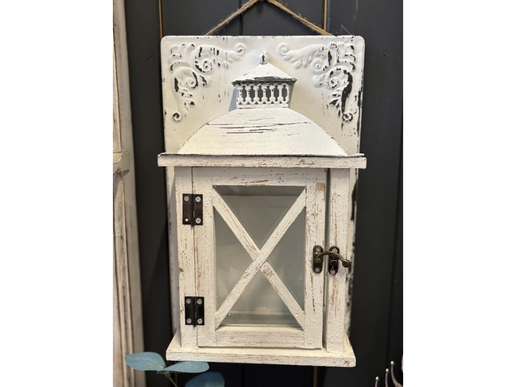 Dřevěná lucerna s jemnou bílou patinou a prosklenými dvířky je umístěna na dekorativní plechové tabuli s reliéfním zdobením. Kombinace dřeva, kovu a patiny vytváří působivý celek. Lucerna má kovové detaily a praktické otevírání pro snadné vložení svíčky nebo LED osvětlení.