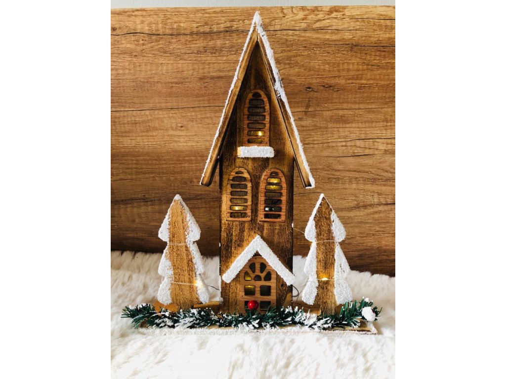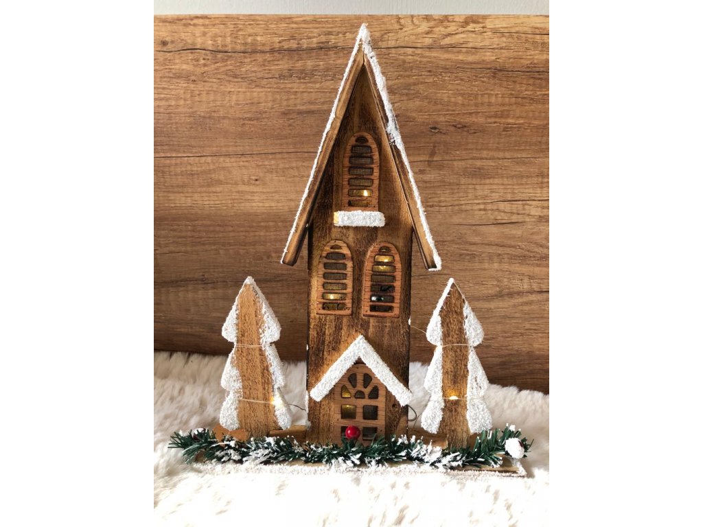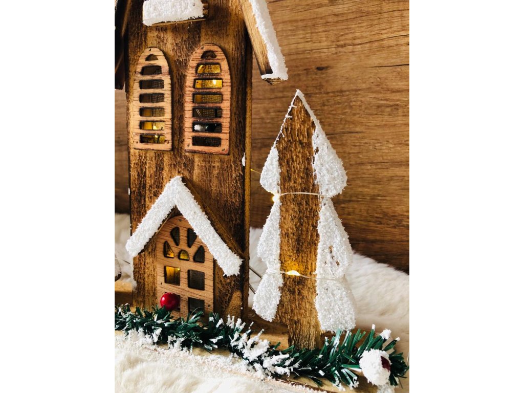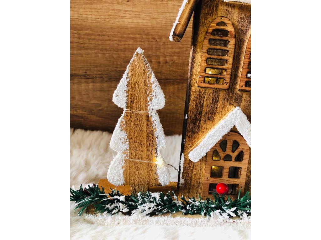 Dřevěná chaloupka obklopená stromky v zimním kabátku v záři světýlek bude hezkou dekorací nejen na chalupě, ale i v moderních interiéru. jednoduchá dekorace, volně stojící, nezabírá moc místa, není nijak široká a tak může být umístěna i na parapetu okna.