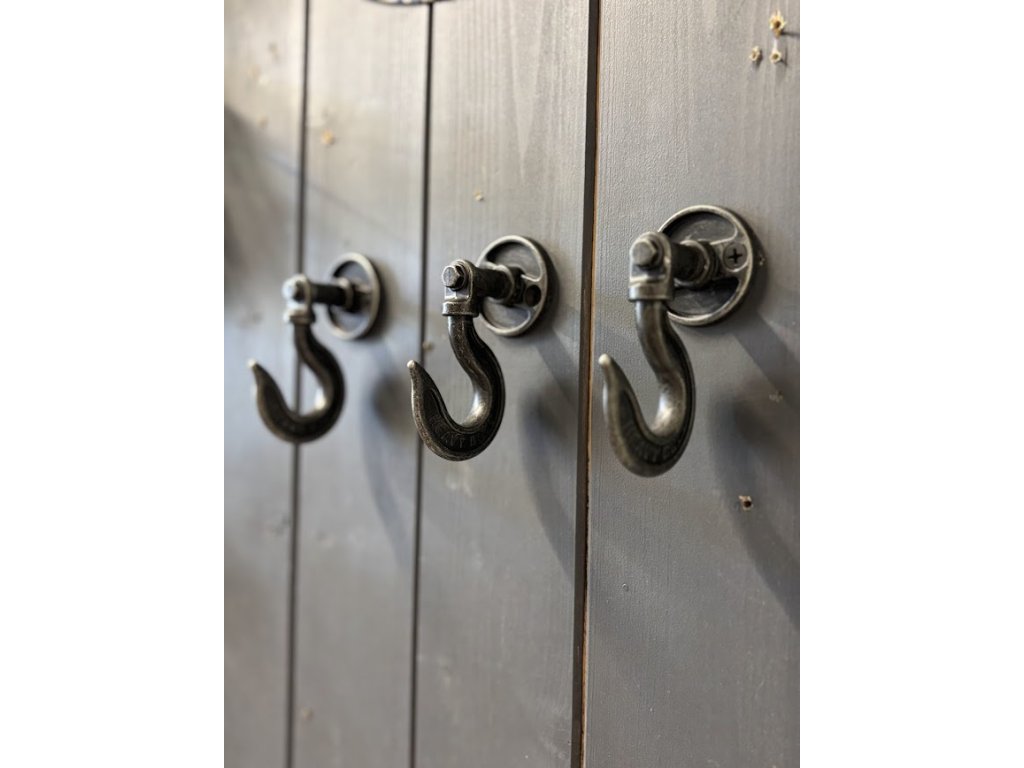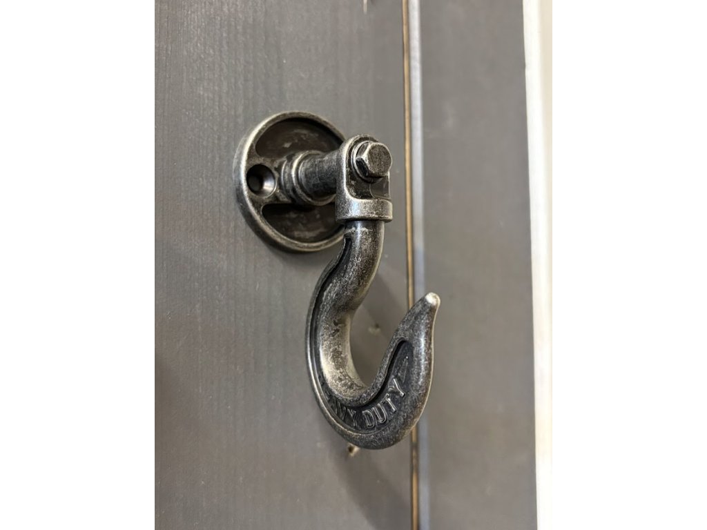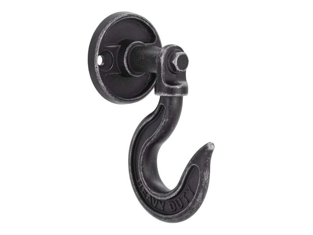 Robustní kovový věšák v industriálním stylu s černým matným povrchem a jemně opotřebovaným vzhledem dodá interiéru vintage nádech. Masivní otočný hák ve tvaru „C“ s nápisem „HEAVY DUTY“ unese i těžší oděvy. Snadné upevnění na zeď díky kulaté základně. Praktický a stylový doplněk pro chodbu, dílnu i rustikálně laděný interiér.