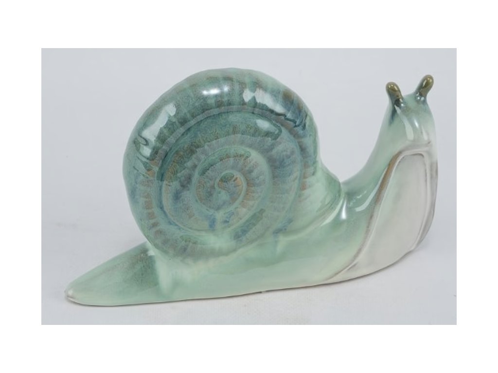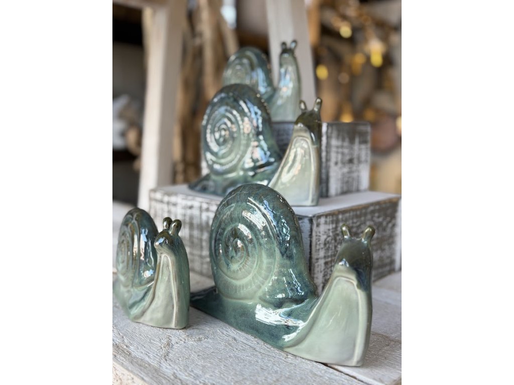Keramická dekorace ve tvaru šneka je milým doplňkem do interiéru i na zahradu. Díky jemné zelené glazuře s přirozeným přechodem barev působí velmi elegantně a krásně vynikne na poličce, parapetu, terase nebo mezi květinami.