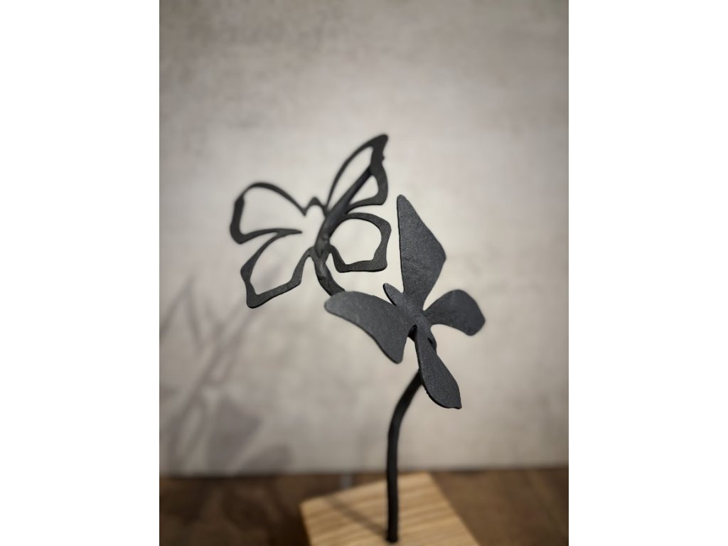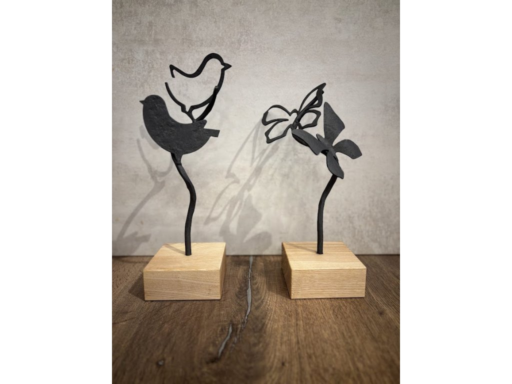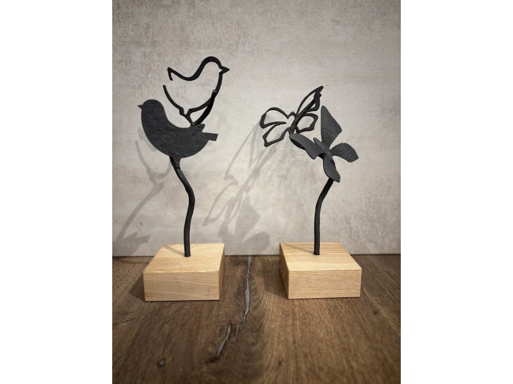 Originální ručně kovaná dekorace, která propojuje umění s přírodou. Plný tvar ptáčka nebo motýla se siluetou v pozadí na masivním dřevěném podstavci působí jemně, ale přitom výrazně. Na slunci vrhají jedinečné stíny, které vytvářejí krásné obrysy v pozadí a dodávají celé scéně živý, proměnlivý charakter.