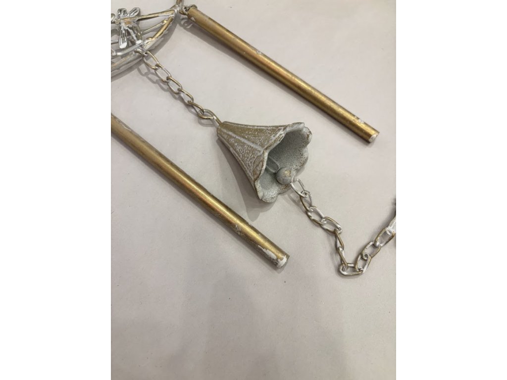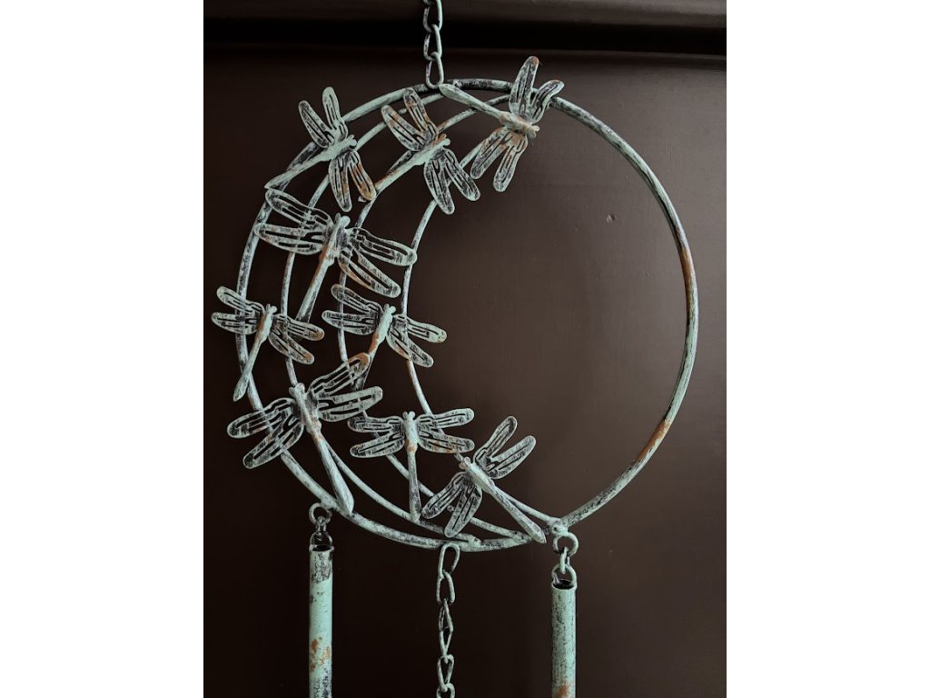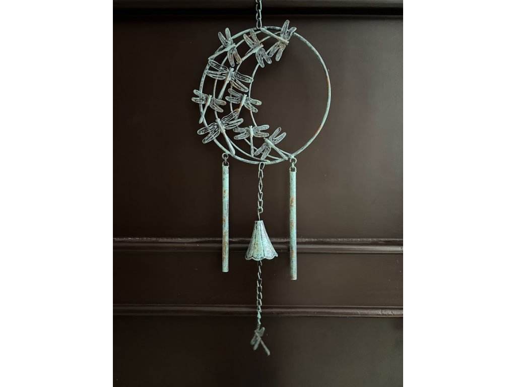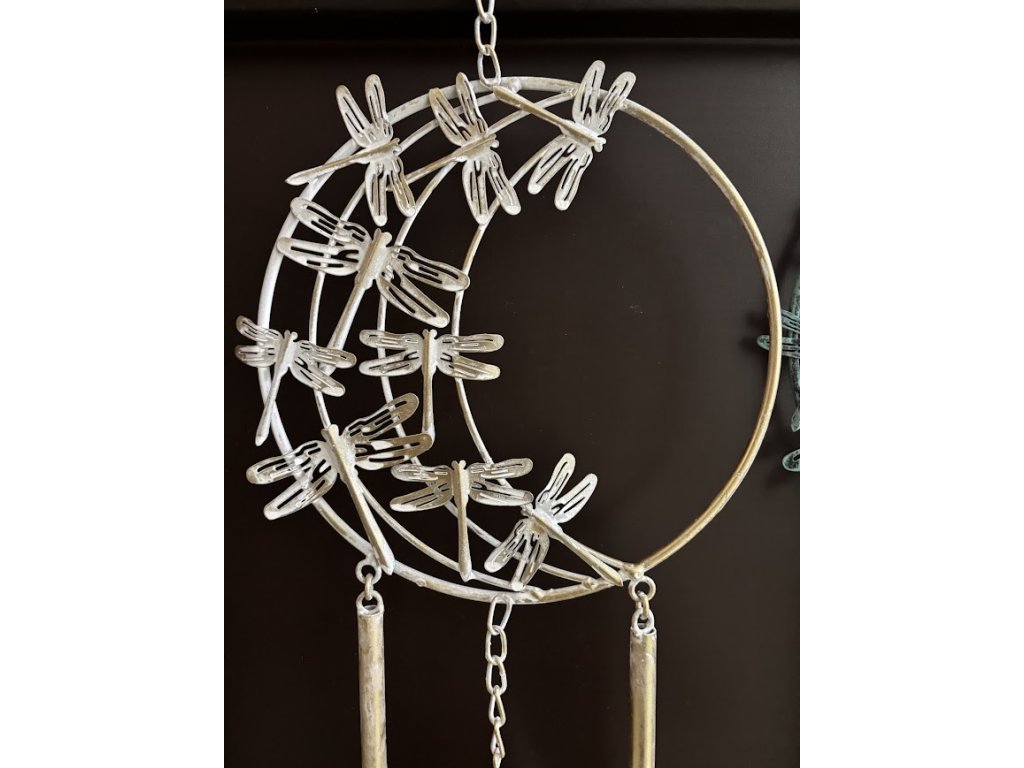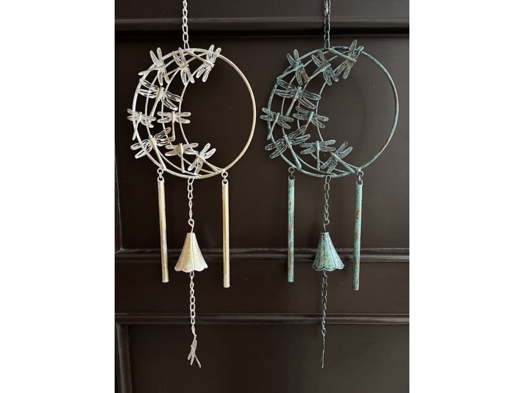 Jemně hrající větrem foukaná zvonkohra s vážkou. Detailně zpracovaná, kovová, ve dvou barvách. Ať už ji umístíte na zahradu, k pergole nebo terase, její zvuk se bude linout okolo celého prostoru. Zvonkohra má tvar kruhu a v něj letící vážky. Spodek je opatřen tyčkami a zvonečkem pro krásný tón.