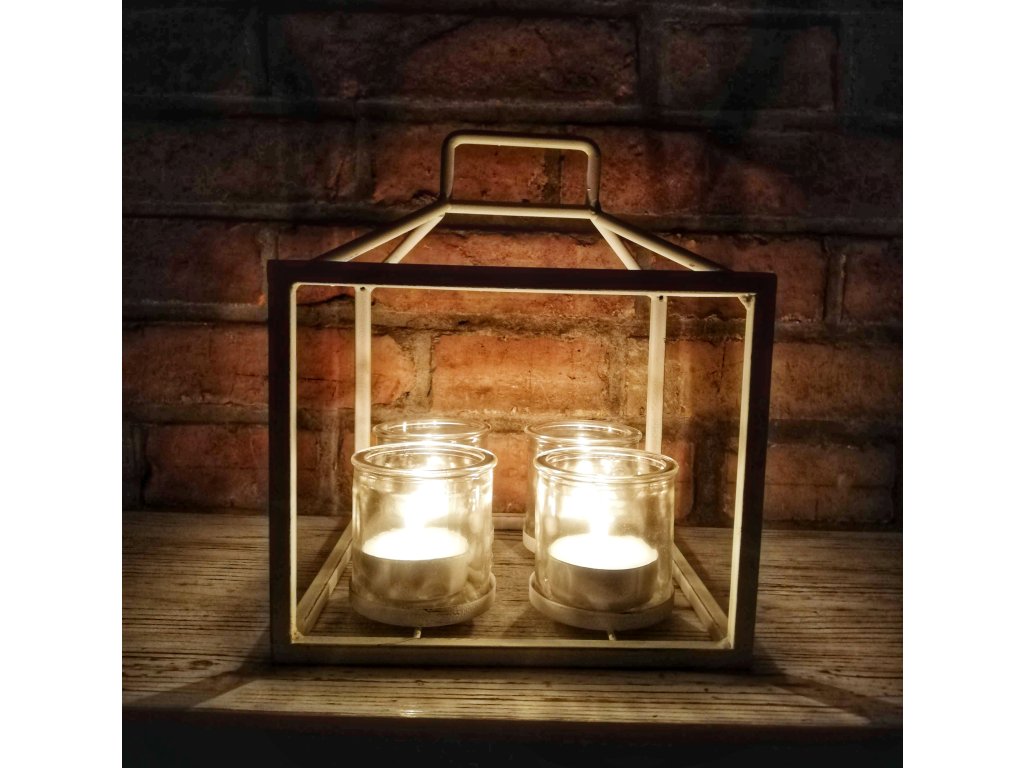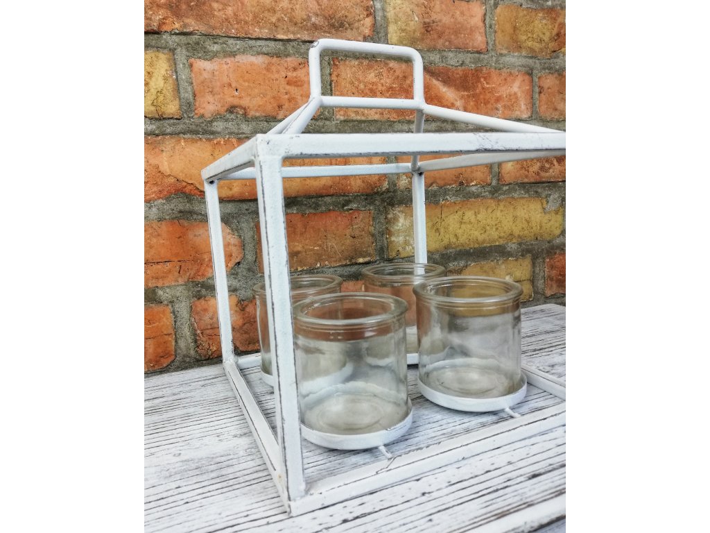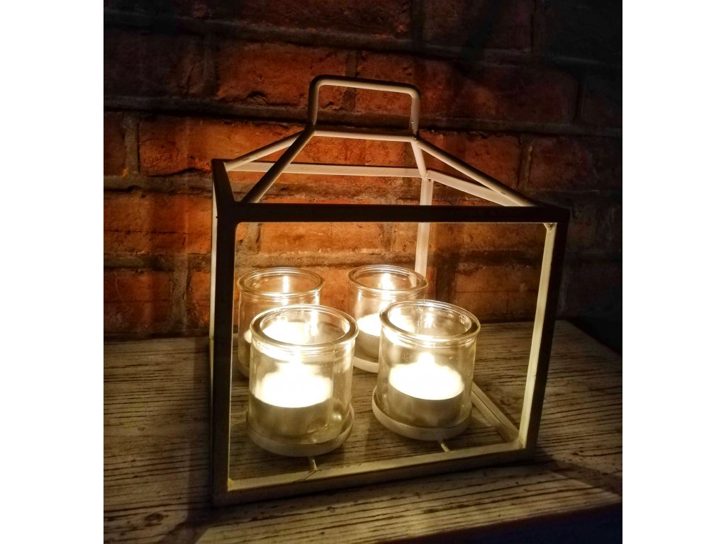 Celoroční kovový svícen tvaru domečku je krásným doplňkem do interiéru zařízeného v přírodních barvách. Můžete umístit až 4 svíčky do skleniček, které jsou součástí.