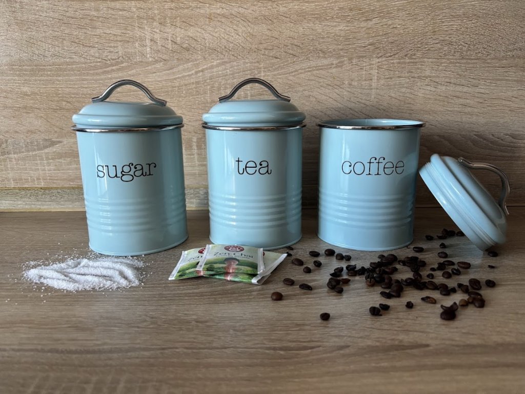 Praktické plechové dózy na nejčastěji používané kávu, čaj a cukr. Omyvatelné, ve dvou barevných provedení. Můžete zakoupit jako set, ale i jednotlivě. Ne každý pije kávu či čaj a tak si to můžete vybrat dle sebe. Materiál je plech.