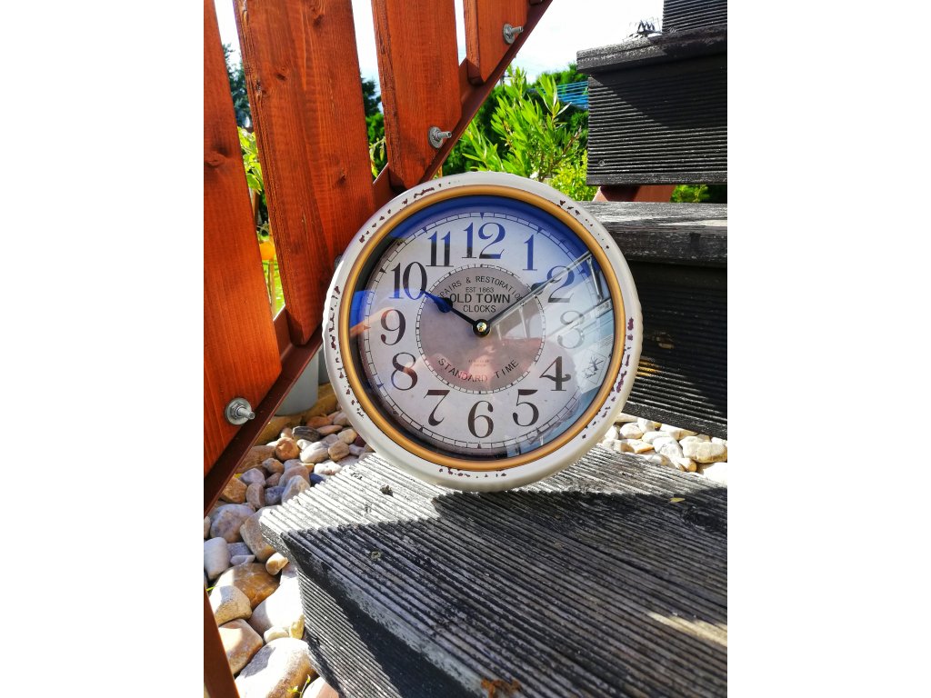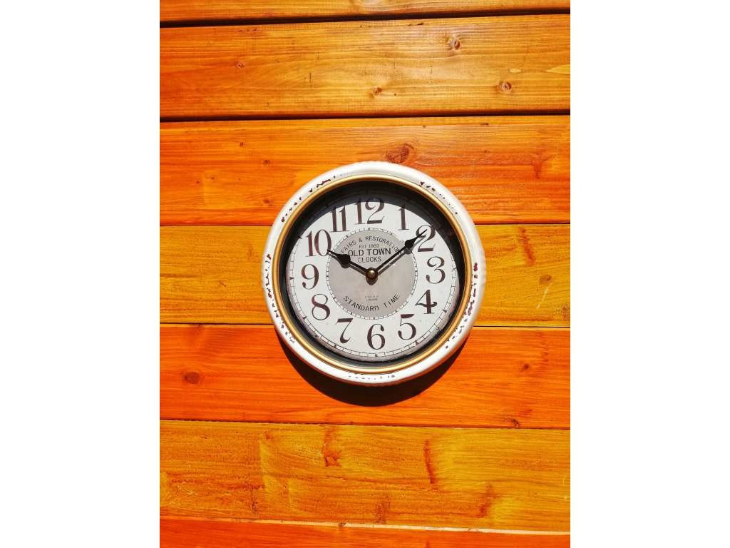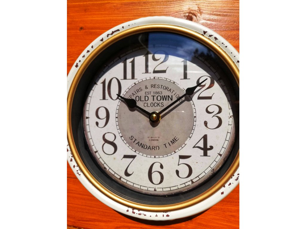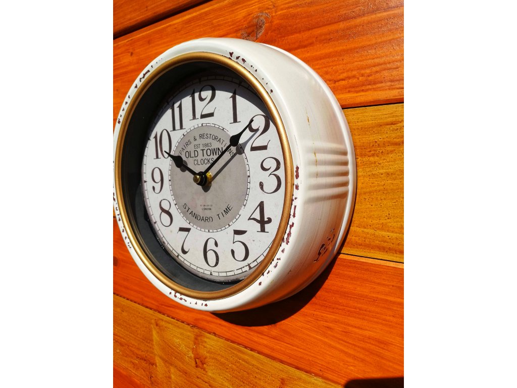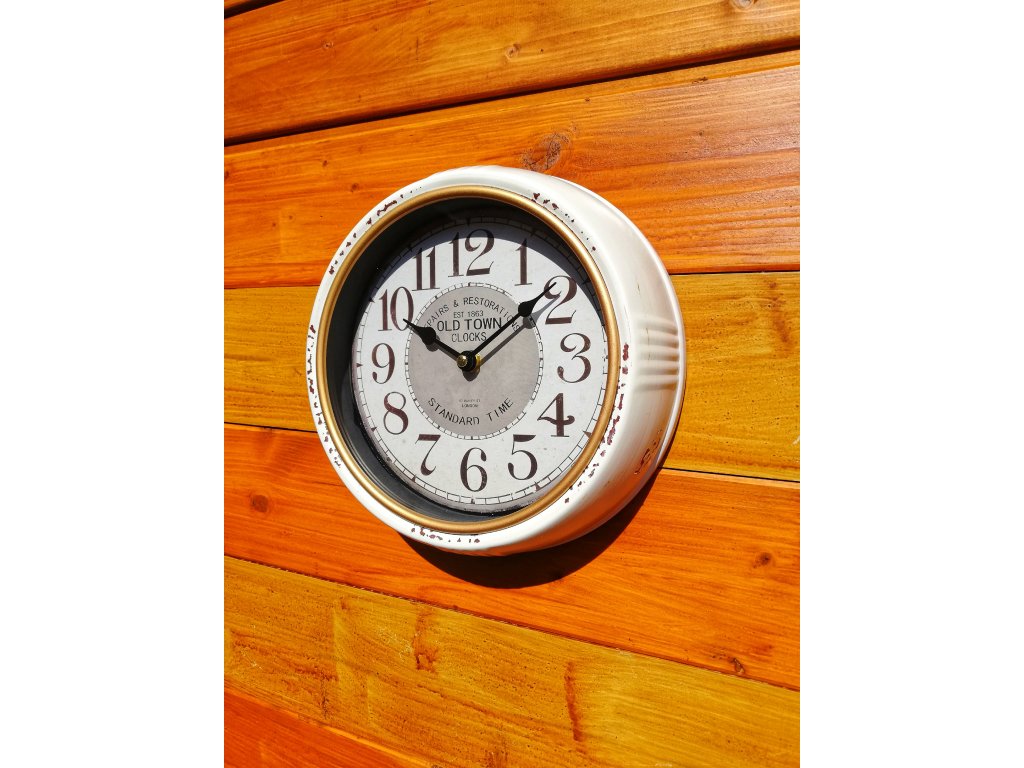 Retro je pořád IN, možná víc než dřív. Proto naši nabídku neustále rozšiřujeme, aby jsme vám mohli nabídnout co je právě aktuální a můžete si tím ozdobit svůj interiér, ale i exteriér. Tyto hodiny jsou krémové barvy, která je místy odřená, aby to nebyla nuda. Rám je ze zlaté patiny, ten tomu dodává šmrnc. Vnitřek je s potiskem, aby to bylo víc reálné. Napájení je na 1xAA baterii.