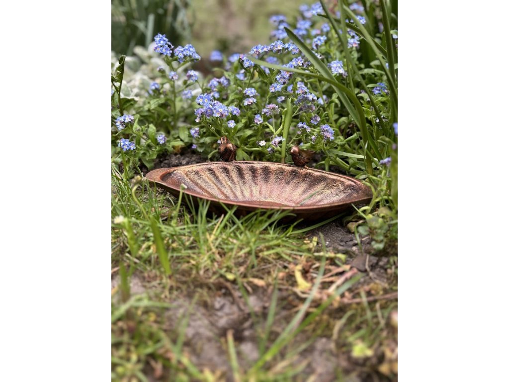 Kovové pítko nebo i krmítko je nedílnou součástí snad každé zahrady. Může být volně položené jako toto nebo jako zápich. Dáváme tak zahradě něco navíc. Naplníme ho vodou nebo v zimě krmením a uděláme tak dobrou věc pro naše zvířecí společníky na zahradě. Toto pítko můžete položit kamkoliv, má tvar listu a ozdobou jsou dva ptáčci, kteří jsou součástí pítka.