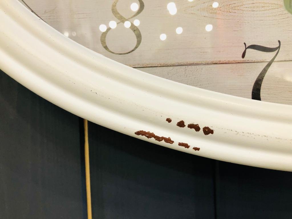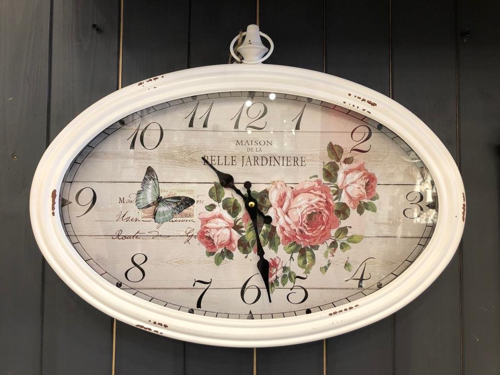 Netradiční tvar a design těchto hodin dodává na originalitě celého produktu. Hodiny jsou oválné v barvě krémové. Barva je místy oloupaná a vnitřek hodin je zdoben růžemi. Hodiny jsou krásnou dekorací do kuchyně, ale i obýváku. Mají ozdobné závěsné očko. Číselník je arabský.