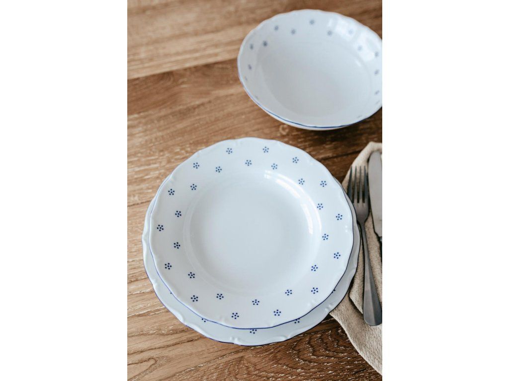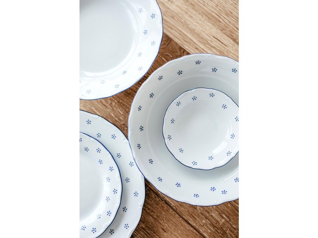 Vraťte se do časů, kdy mělo stolování své kouzlo. Jemný porcelán s drobným motivem pomněnek a decentním modrým lemem v sobě nese nostalgii, klid a hřejivou atmosféru domova. Přesně takové, jaké si pamatujete od babičky.