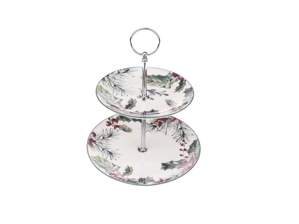 Dvoupatrový porcelánový etažér s vánočním motivem je ideální pro servírování cukroví, dezertů nebo drobných slaných dobrot. Jemný vzor s cesmínou a jehličím dodá vašemu stolu sváteční atmosféru a působí slavnostně i útulně. Díky kovové rukojeti se snadno přenáší a stane se ozdobou každého vánočního stolování.
