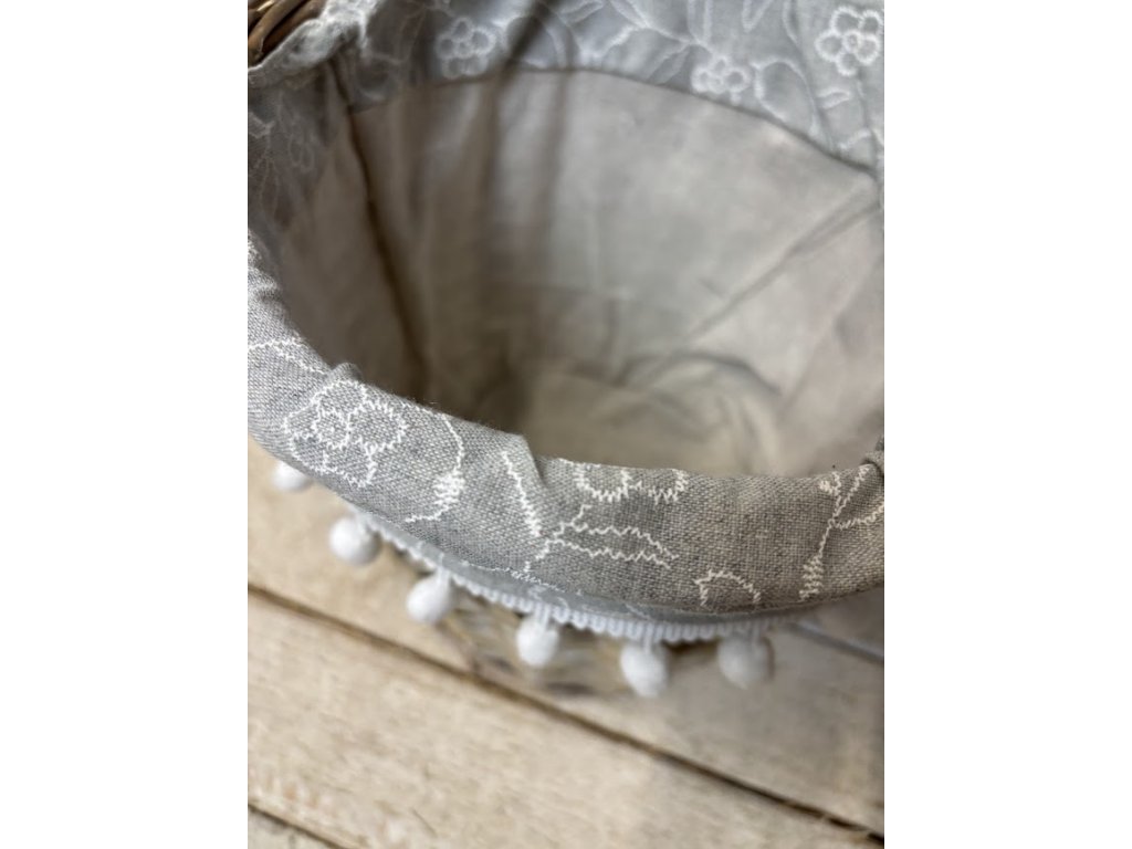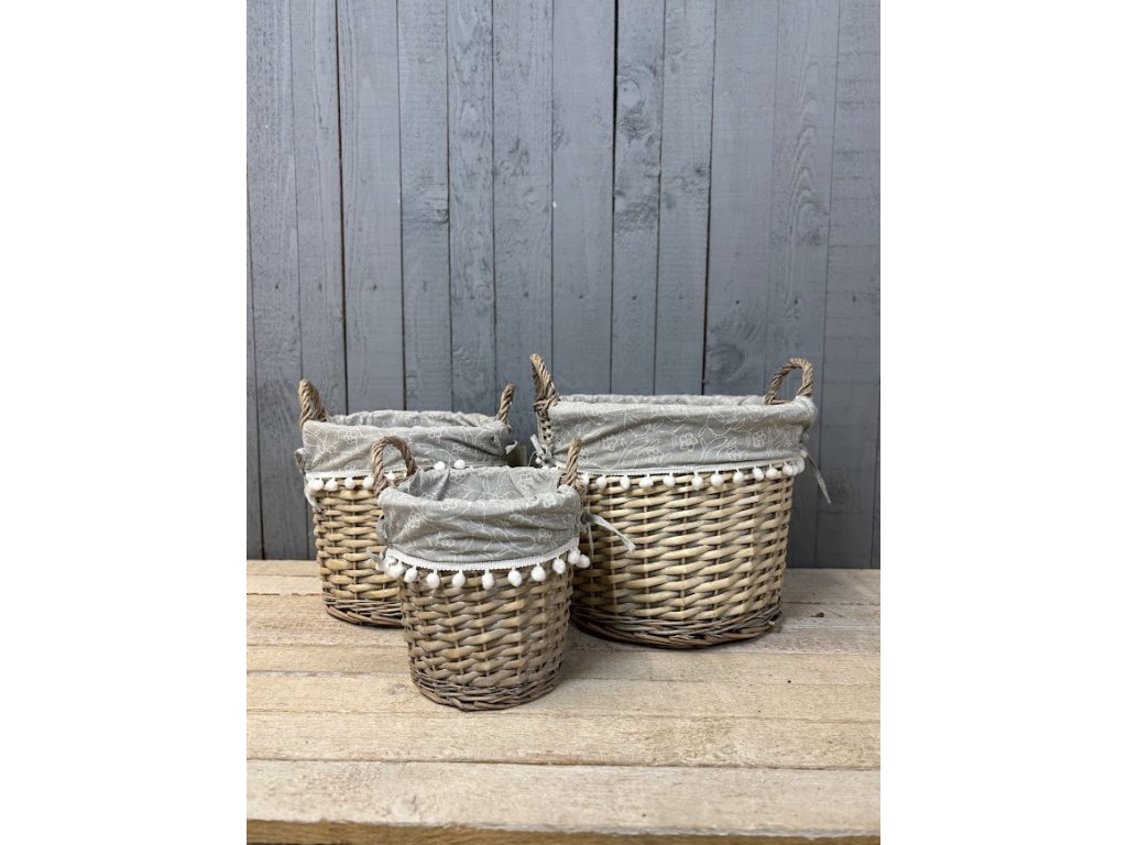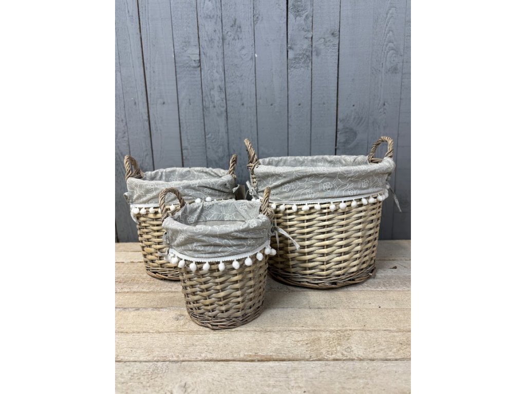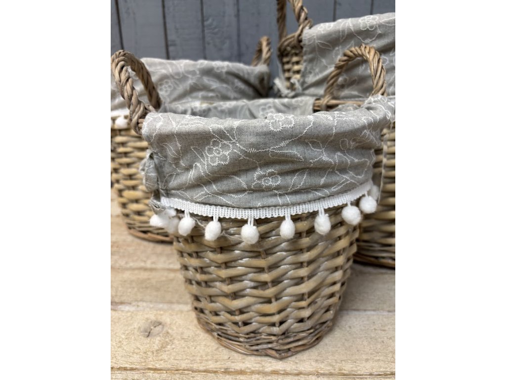 Proutěné koše, které spojují praktické využití s jemným dekorativním vzhledem. Koše jsou vypletené z přírodního proutí a doplněné látkovou výstelkou v šedé barvě s něžným motivem bílých květů. Okraj látky zdobí hravé bambulky, které dodávají košům originální a útulný vzhled.