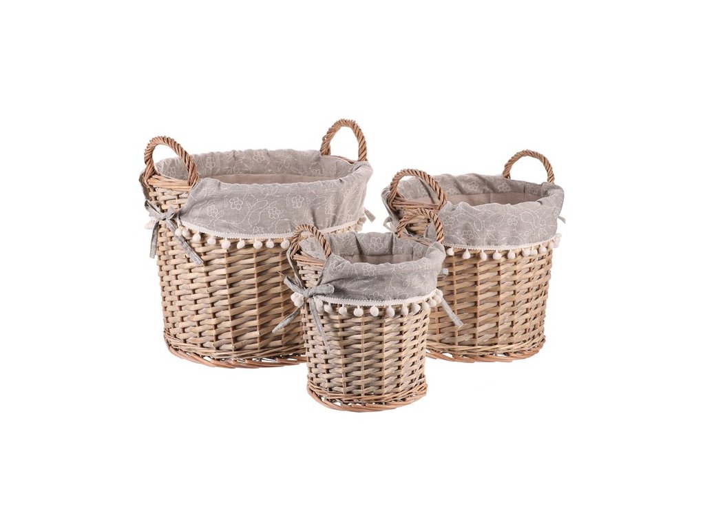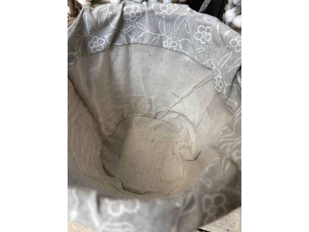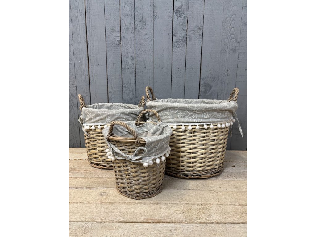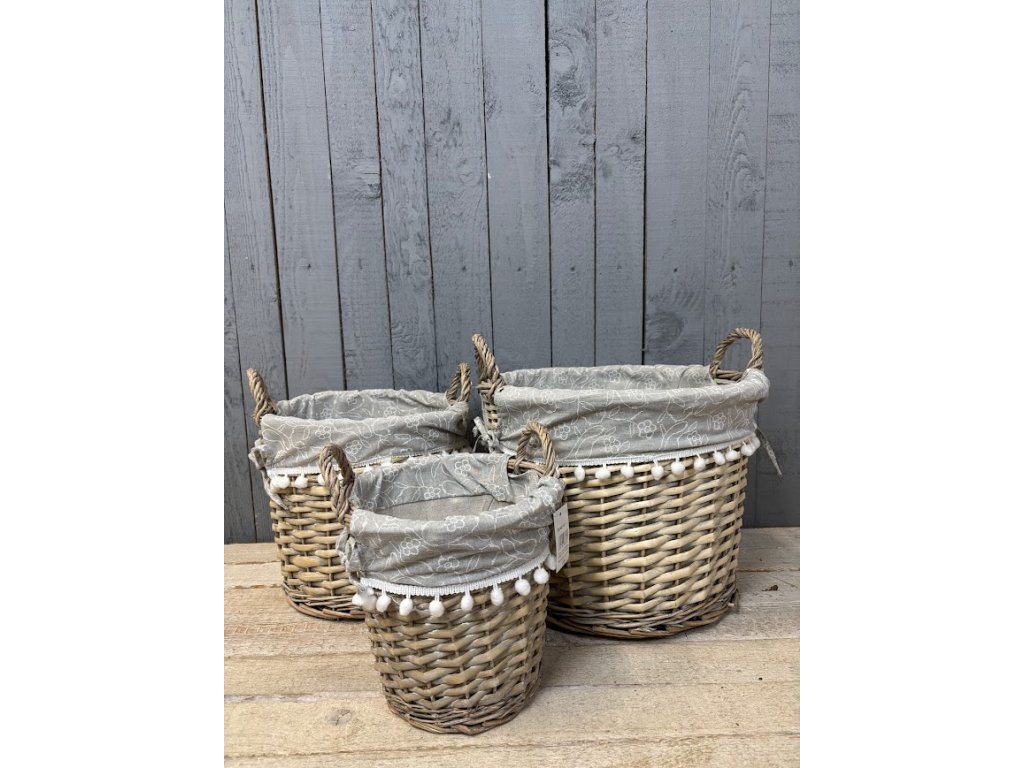 Proutěné koše, které spojují praktické využití s jemným dekorativním vzhledem. Koše jsou vypletené z přírodního proutí a doplněné látkovou výstelkou v šedé barvě s něžným motivem bílých květů. Okraj látky zdobí hravé bambulky, které dodávají košům originální a útulný vzhled.
