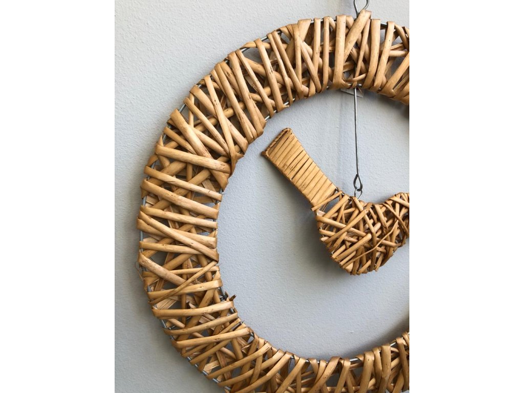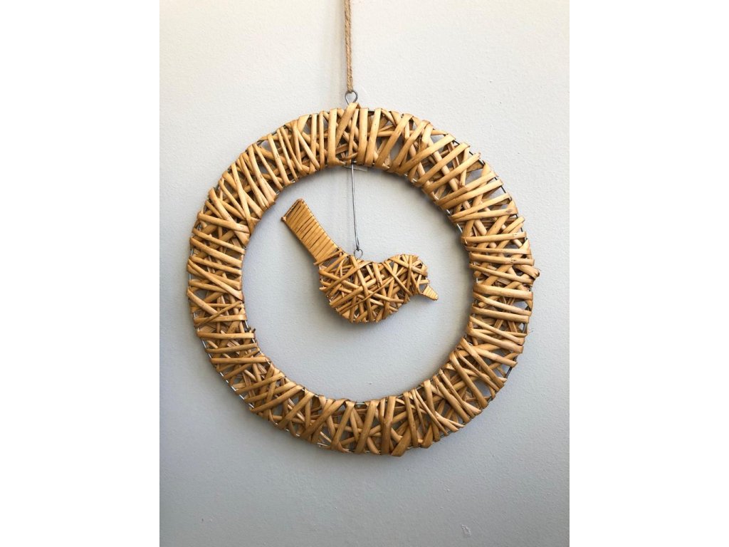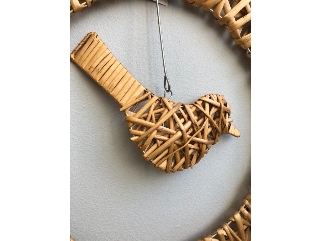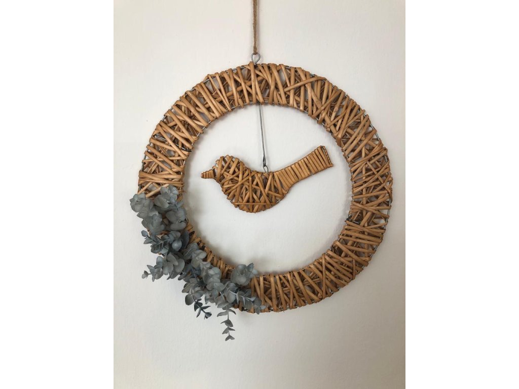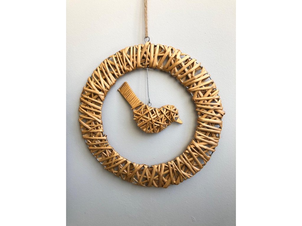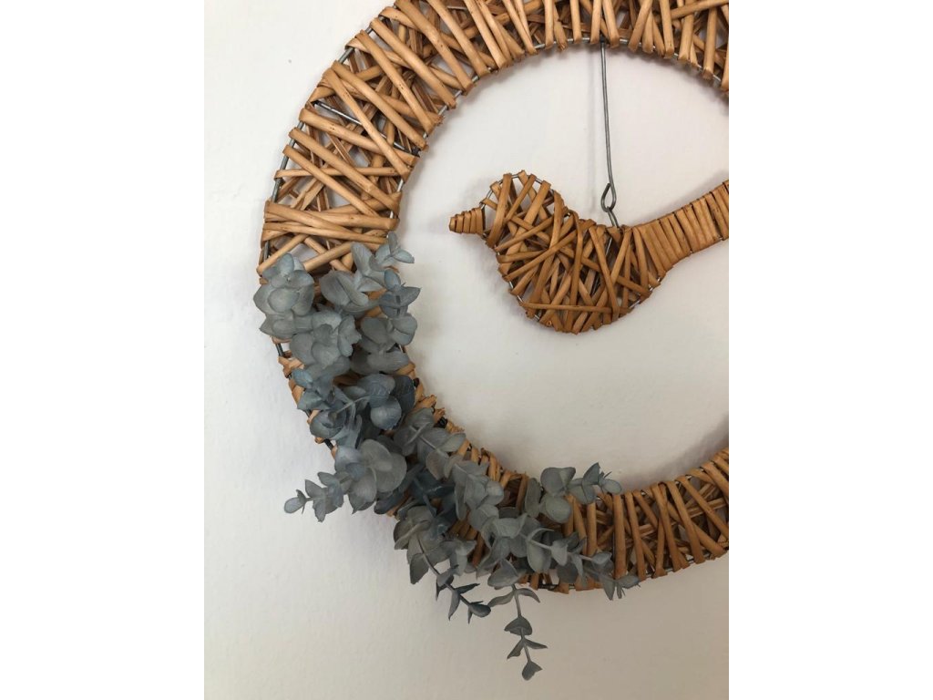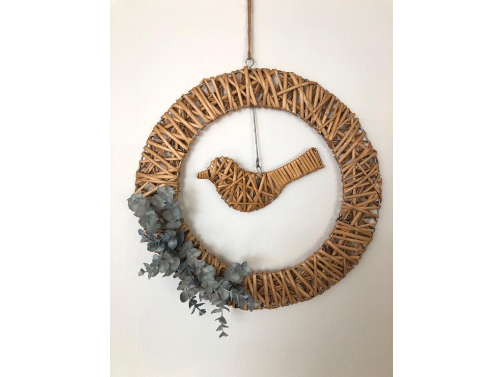Originální řešení tohoto věnce, který můžete i nadále dekorovat. Věnec je z drátěné konstrukce omotán barveným proutím. Stejně tak je i ptáček, který je zavěšený na háčku u věnce. Věnec lze i dekorovat květy či větvičkami a udělat si ho podle sebe.