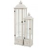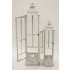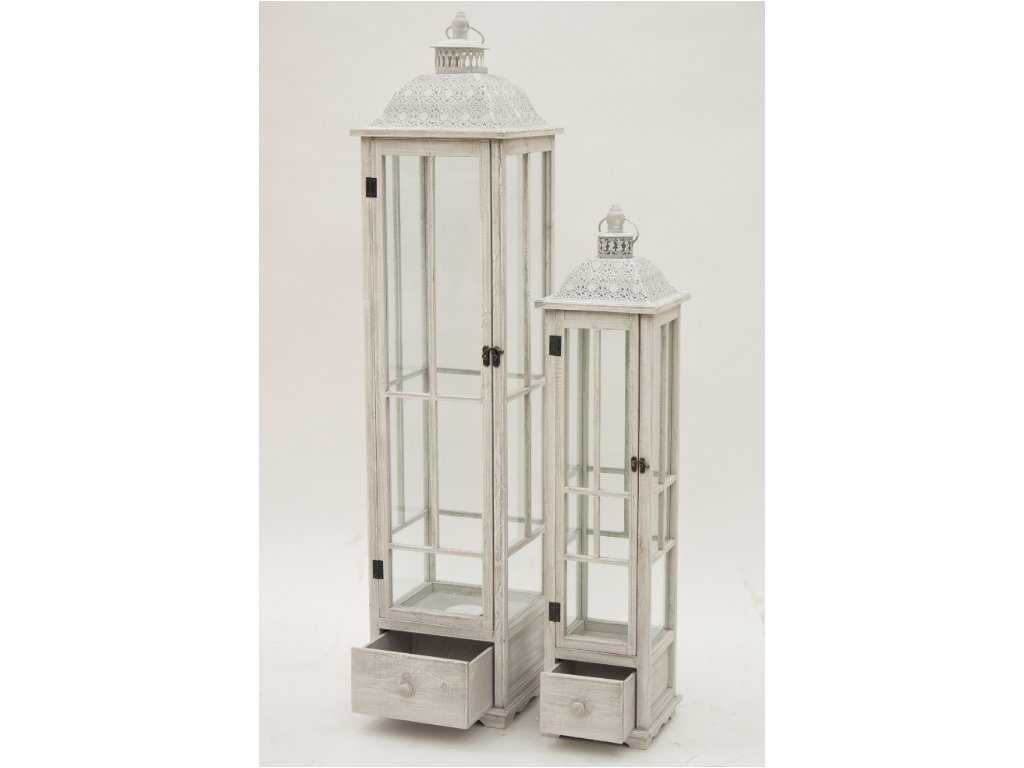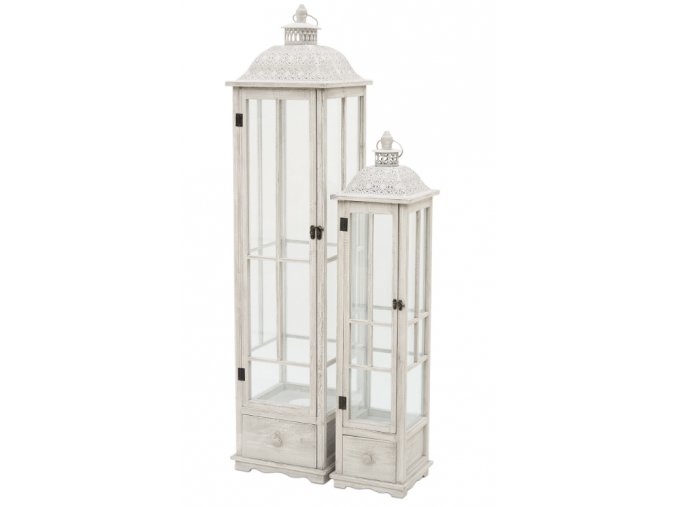 Lucerny jsou v dnešní době nedílnou součástí snad každého interiéru a exteriéru. Mají různé podoby, velikosti a barvy. Nově jsme pro vás našli tyto vysoké, které jsou velmi oblíbené. Dají se do nich dát nejen velké svíčky, ale také světýlka nebo je jinak nadekorovat. Díky prostoru uvnitř se vaše fantazie může vyřádit. Lucerny jsou natřeny na bílou barvu, panty jsou hnědé a spodek zdobí šuplík, který je plně funkční. Lucerna je vyplněná sklem a vršek je podobný vzoru květin a je kovový.