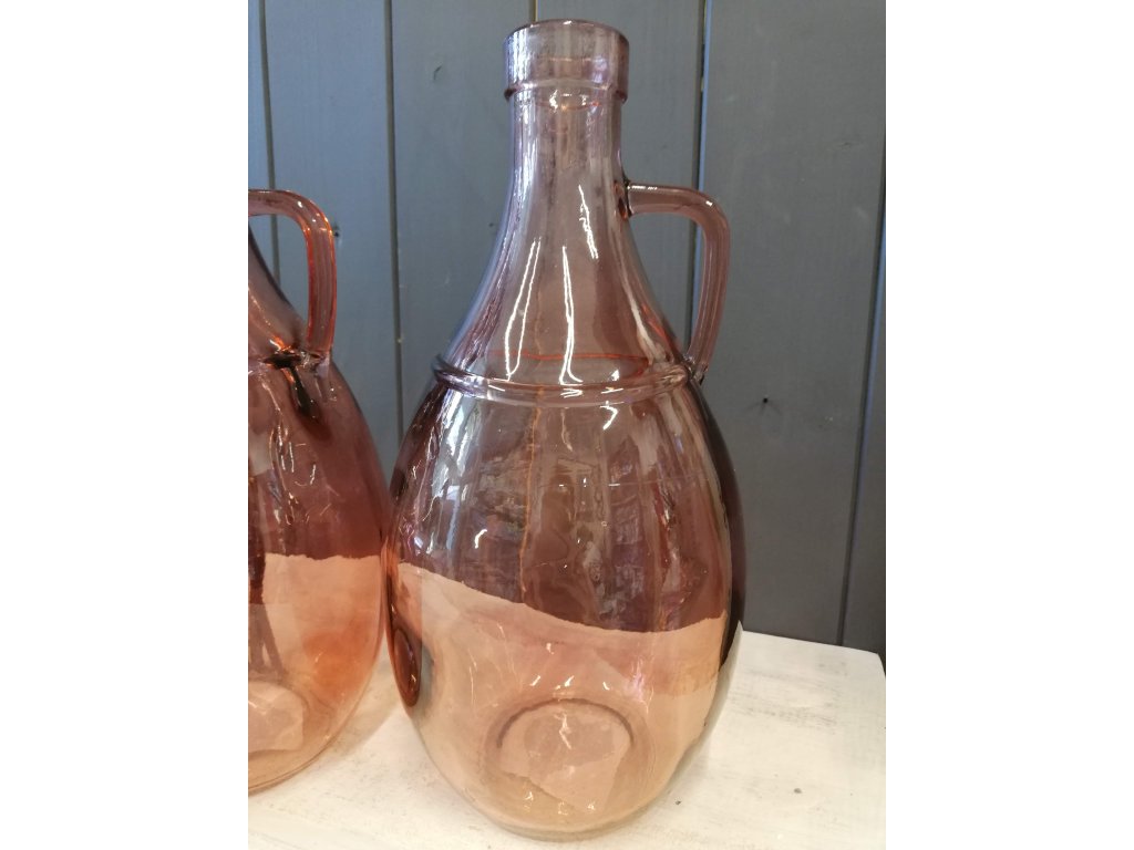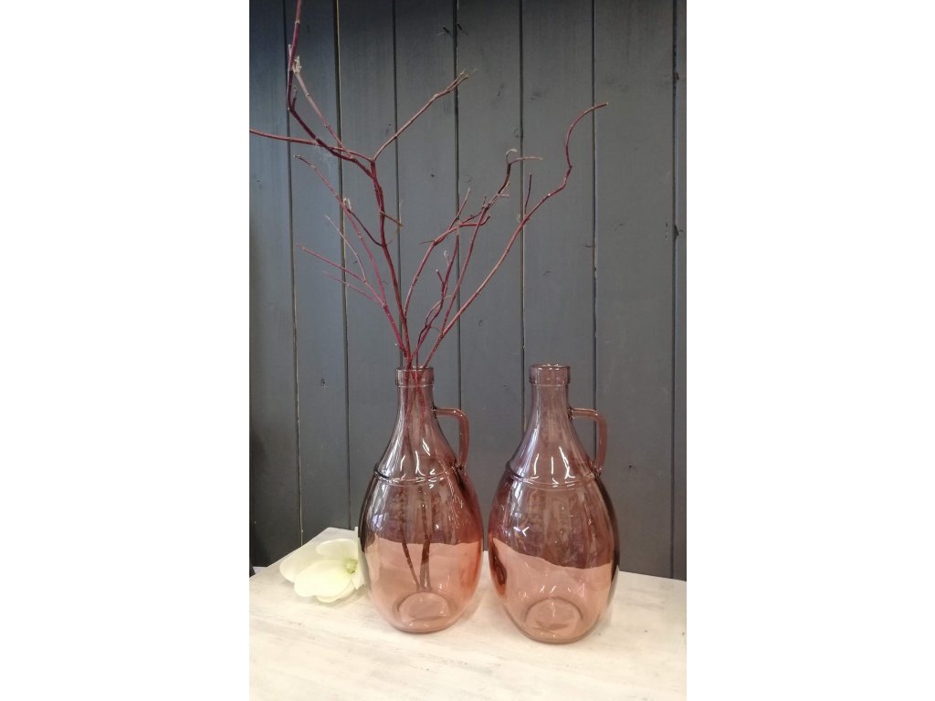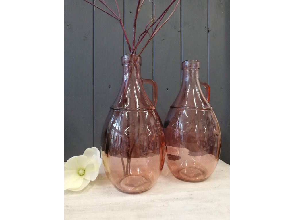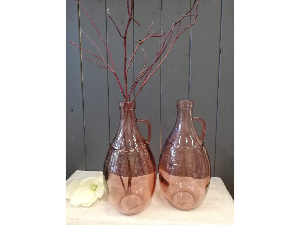 Vypadá jako láhev, ale není to láhev. Je krásná, skleněná, barvou do růžova nebo hněda s uchem. Váza, není to na žádnou velkou květinu, ale 1 větvičku či pár stonků lučního kvítí. Je dokonalá sama o sobě, výškou 26cm udělá z interiéru něco výrazného, neobyčejného.
