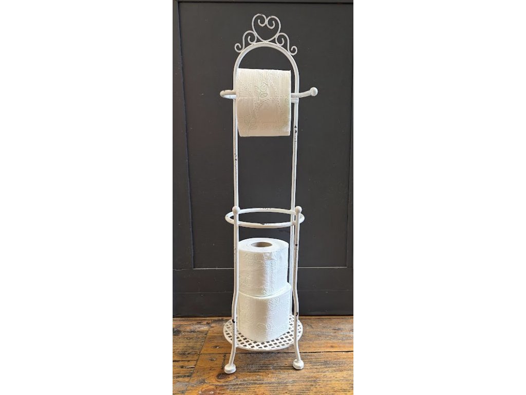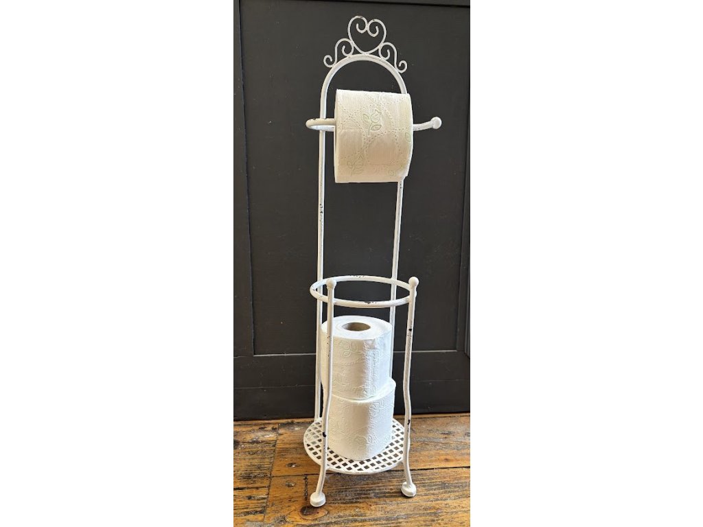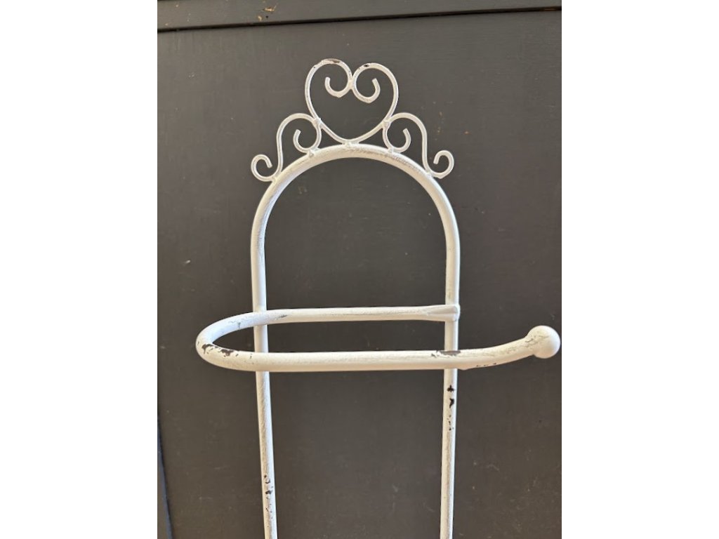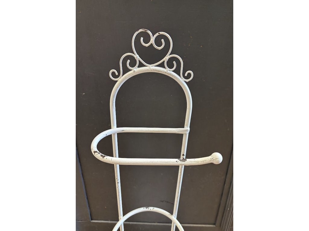 Ručně dělaný kovový bílý stojan na toaletní papír. Do spodní části se dají dát 2ks. Barva bílá.
