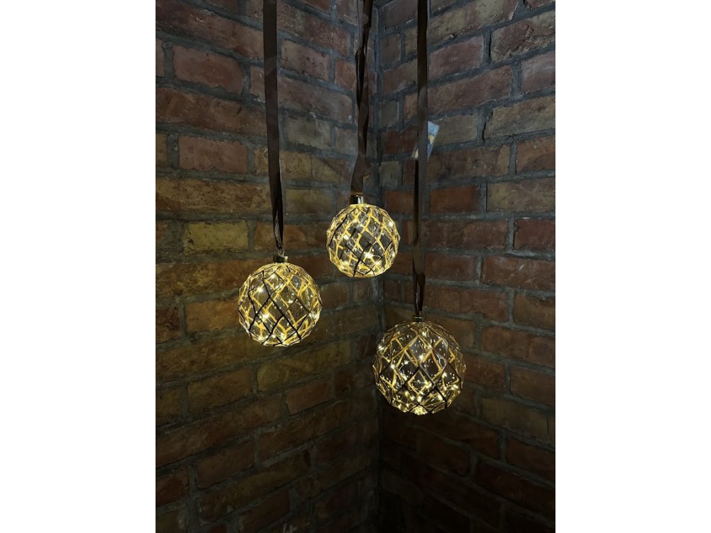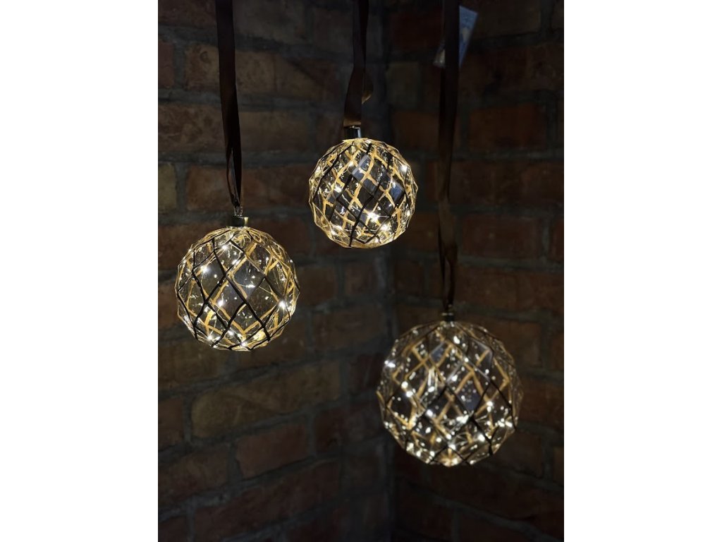 Dekorační koule zavěšené na hnědé stužce, doplněné jemnými světýlky na baterky, rozzáří váš domov kouzelnou atmosférou. Každá koule je plastová a zdobená decentní zlatou linkou, která jí dodává elegantní vzhled.