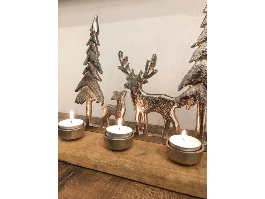 Vánoční adventní věnec z krásného mangového dřeva se stříbrnými dekoracemi stromů a jelenů, které jsou umístěny za kalíšky na čajové svíčky. Při jejich zapálení se tyto dekorace krásně odráží ve tmě. Jednoduchost a čistota. není třeba nijak dozdobovat. Vhodné umístit někde ke zdi. Mangové dřevo je opracované a každý kus má trošku jiný odstín. Na fotkách jsou uvedeny, není možné vybírat. Bude dodán namátkově.