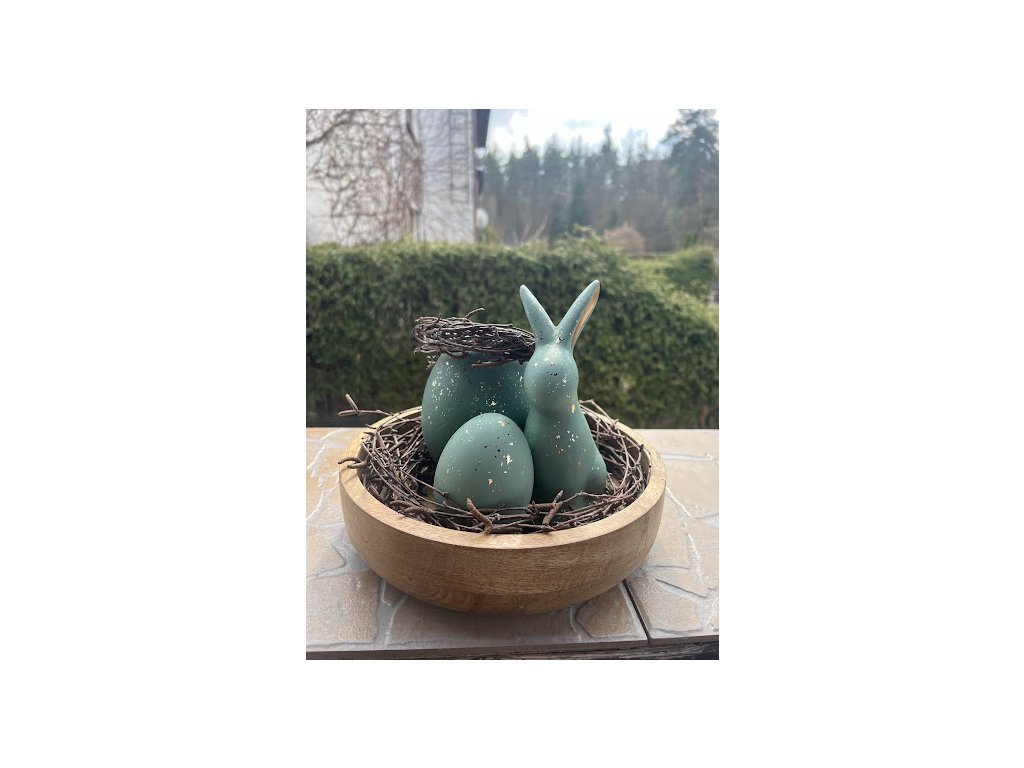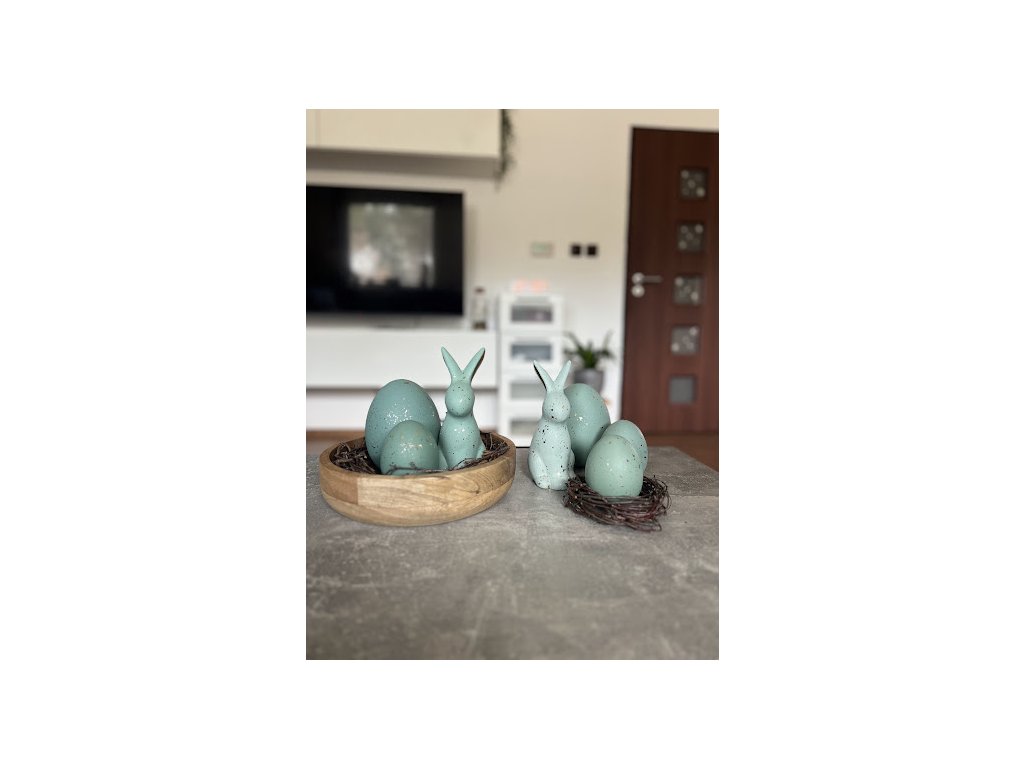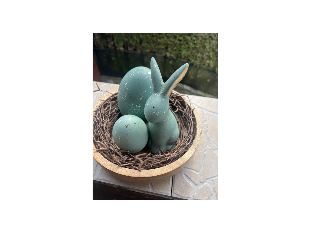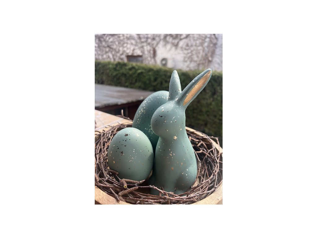 Tyto velikonoční dekorace v podobě vajíček a zajíčků jsou vyrobeny z kvalitní keramiky a díky volně stojícímu provedení je můžete snadno umístit kamkoliv – na sváteční stůl, parapet, komodu nebo třeba do již osázeného květináče s jarními květinami. K dispozici jsou ve dvou jemně odlišných odstínech tyrkysové, doplněných o decentní zlaté šupinky, které spolu krásně ladí a tvoří zajímavou velikonoční výzdobu.