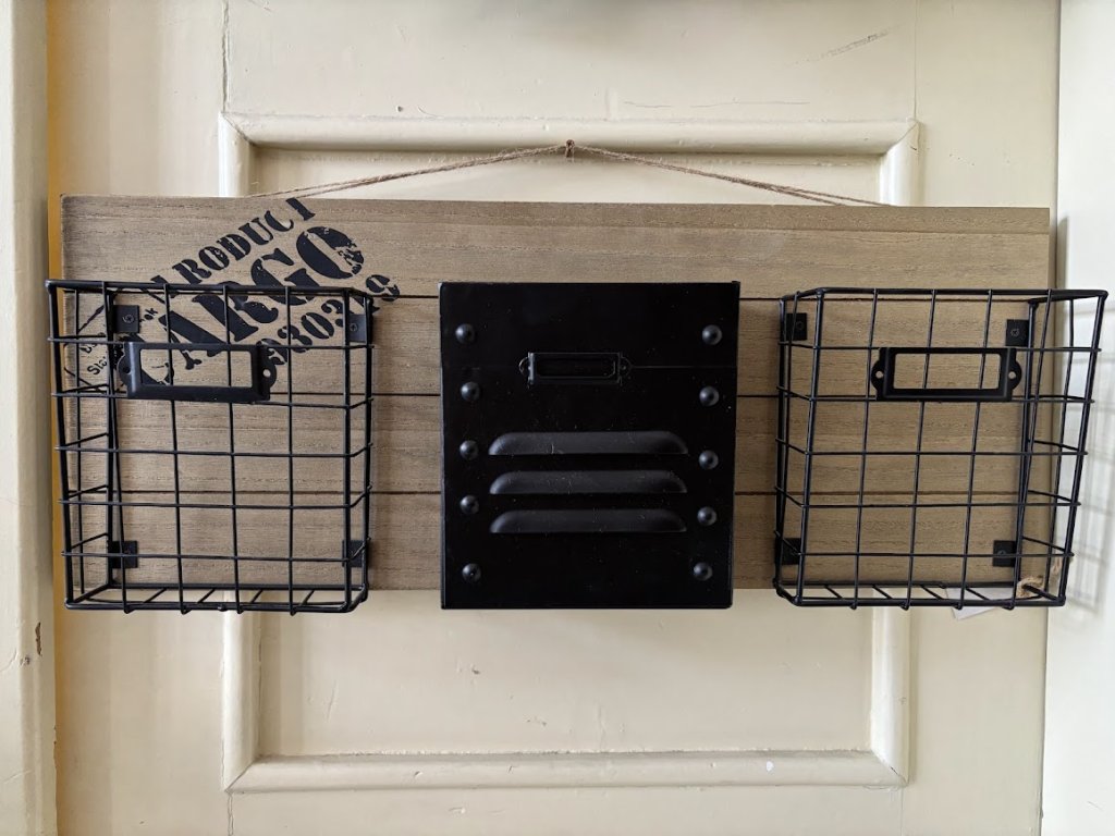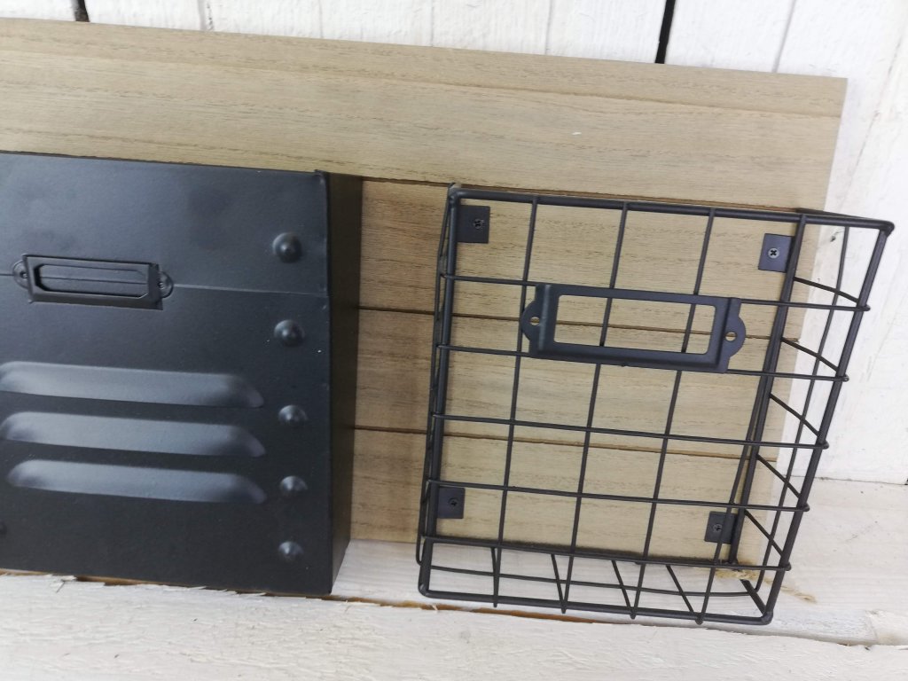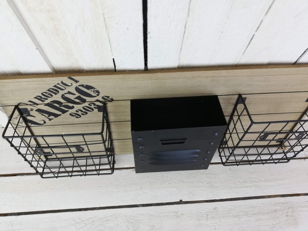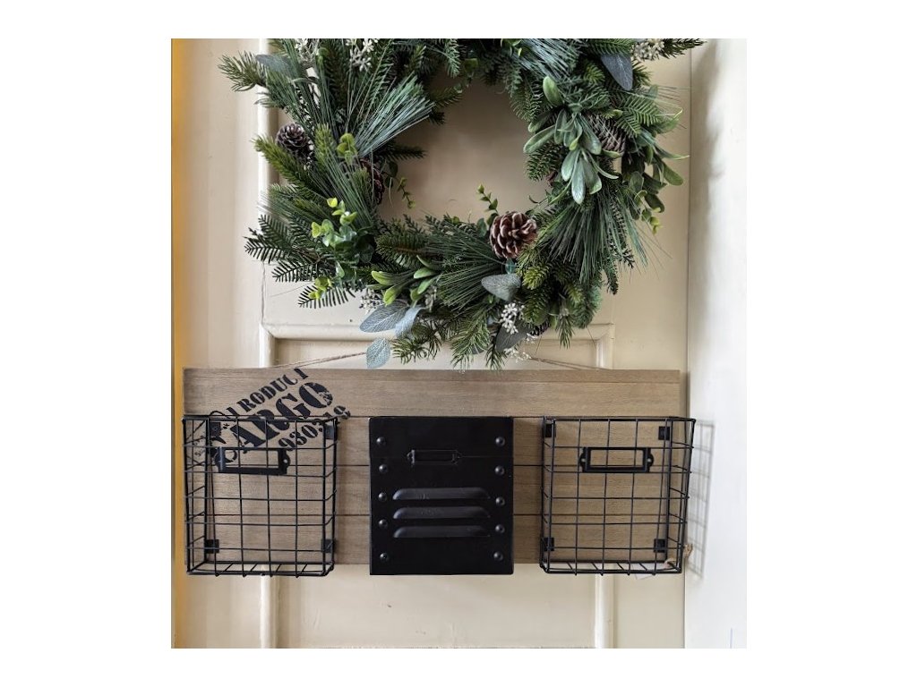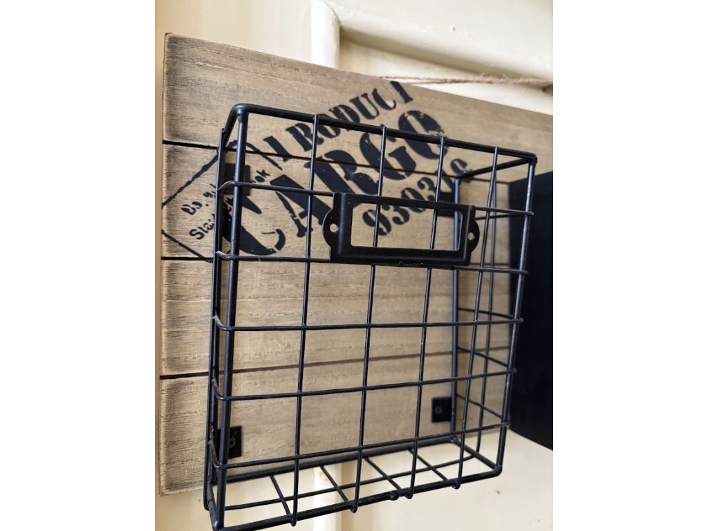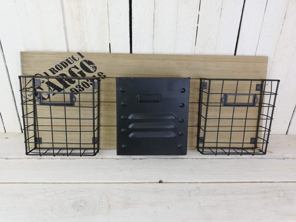 Krásné kovové košíky jako závěs na dřevěné desce s potiskem. Hodí se jak do terasy či pergoly ven tak do pracovny či kuchyně. Záleží jen na vás, kde to použijete.