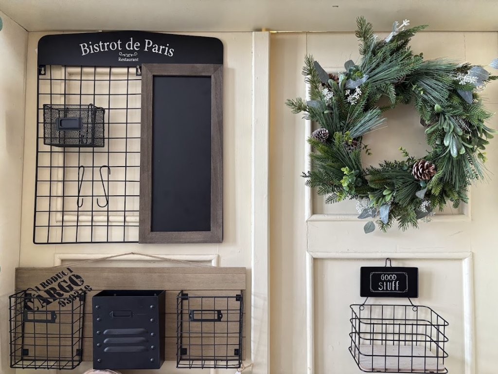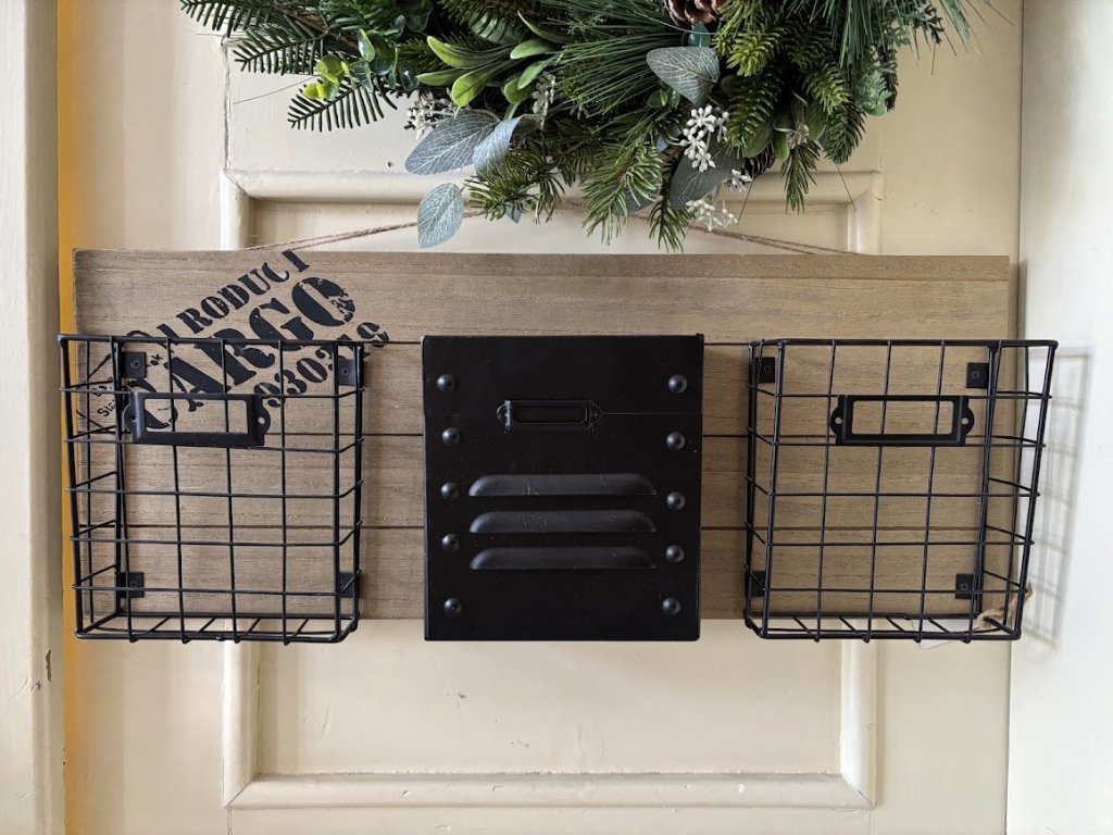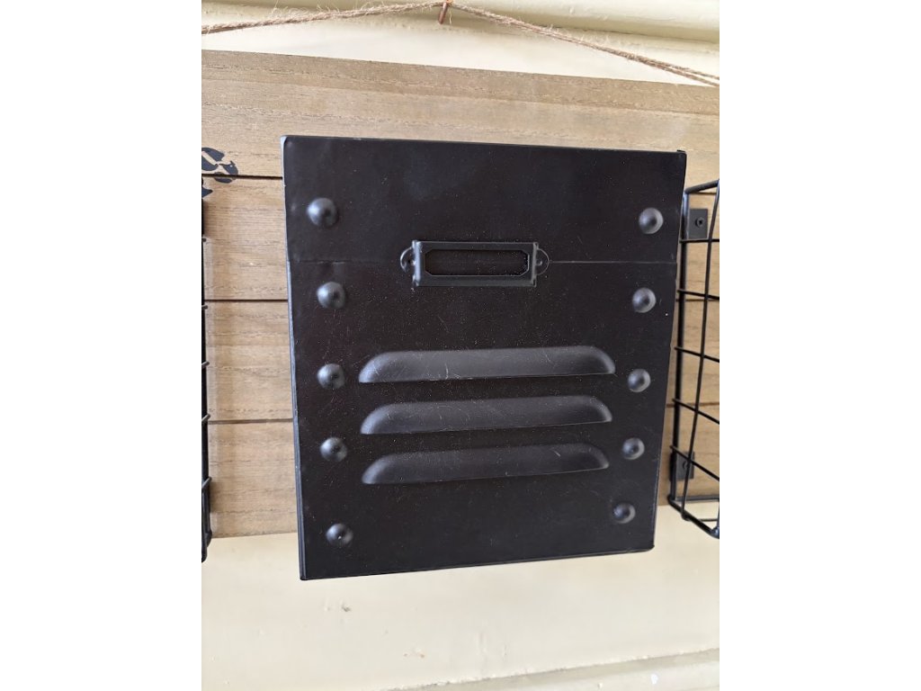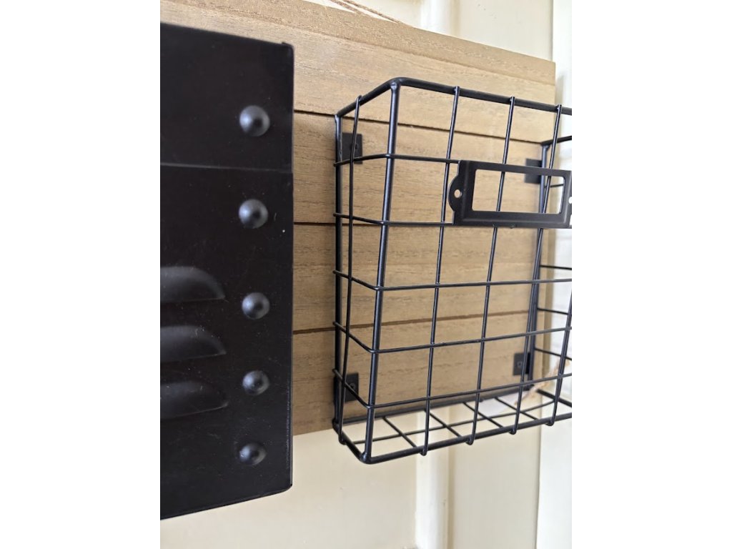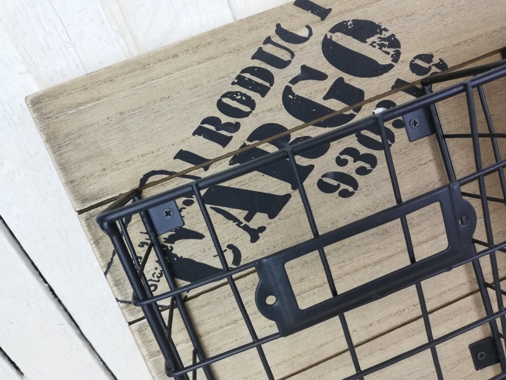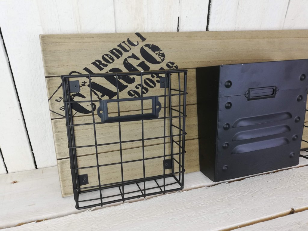 Krásné kovové košíky jako závěs na dřevěné desce s potiskem. Hodí se jak do terasy či pergoly ven tak do pracovny či kuchyně. Záleží jen na vás, kde to použijete.