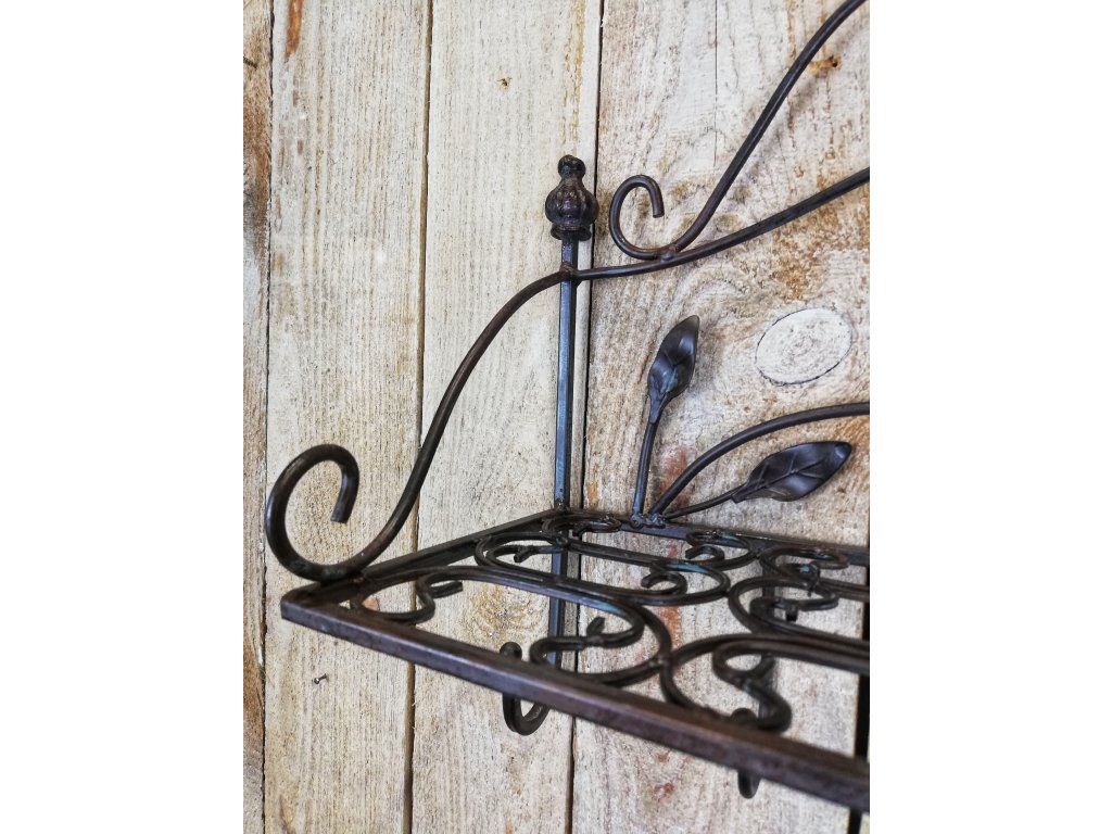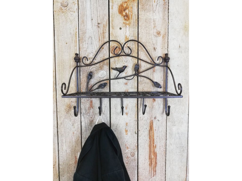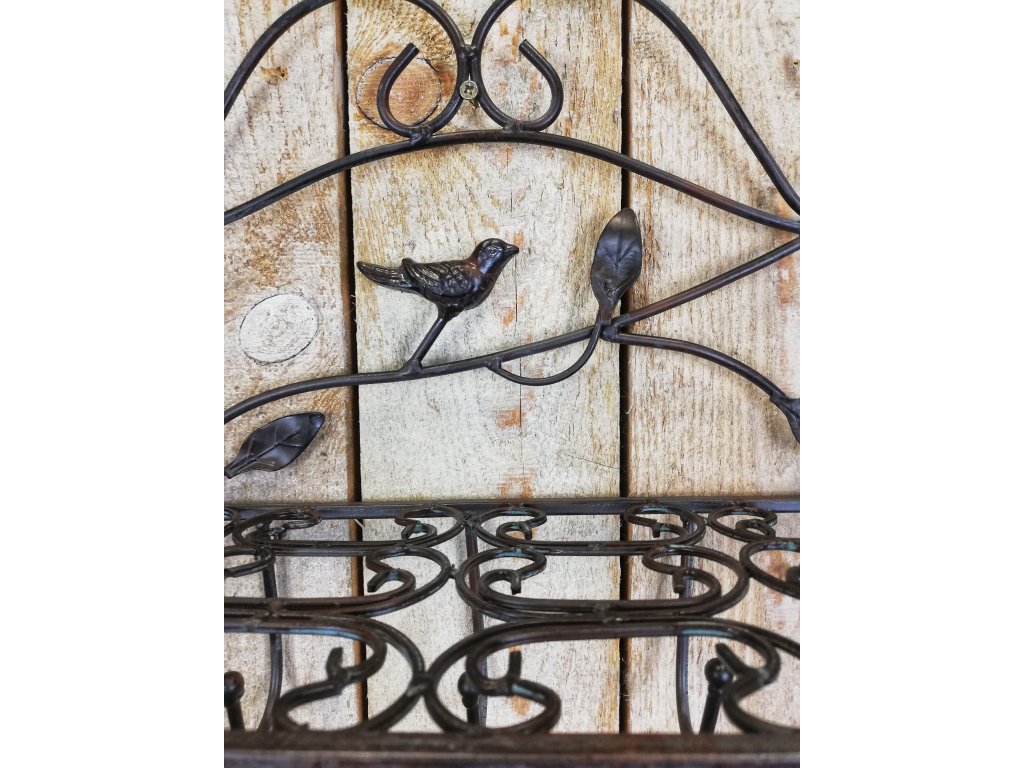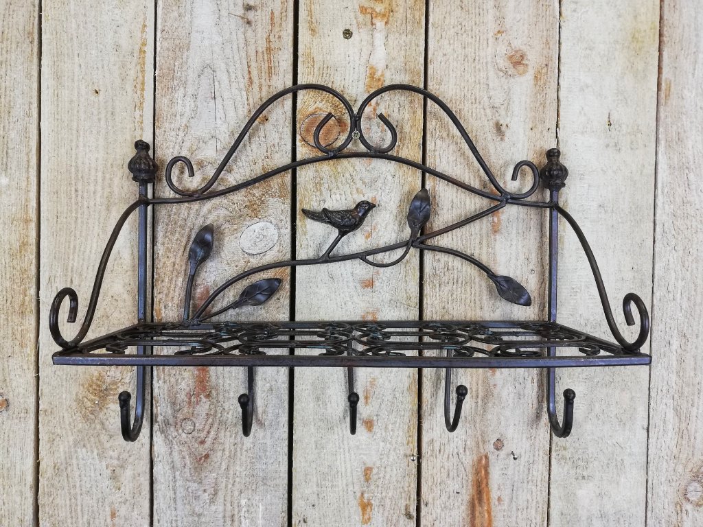 Originální polička, kterou můžete mít doma i venku, design kovu s ornamenty a ptáčky, která ladí s dalšími doplňky jako stoličkami, které nabízíme. na poličku lze umístit cokoliv, květinu, šátek, rukavice, podle toho, kde ji budete mít umístěnou. Krásný kousek, který si doma dotvoříte podle svého.