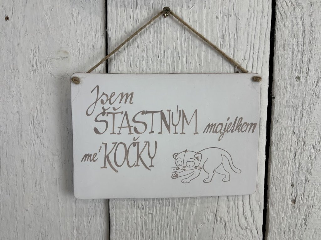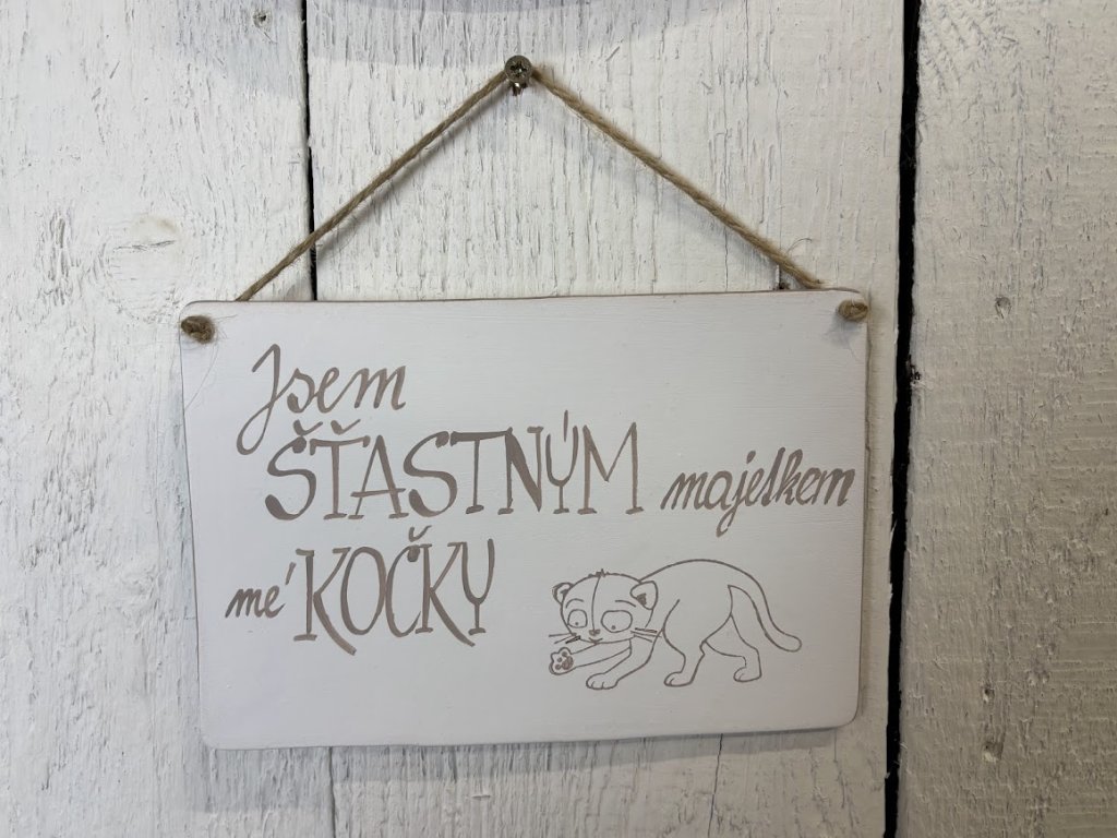 Vtipná dekorace na zeď například jako dárek k narozeninám. Malá pozornost co potěší a vykouzlí úsměv na tváři. Keramická dekorace na zeď ve tvaru domečku s cedulkou "Vítejte u NÁS" nebo obrázku s kočkou a veselým nápisem "Jsem ŠŤASTNÝM majetkem mé KOČKY"